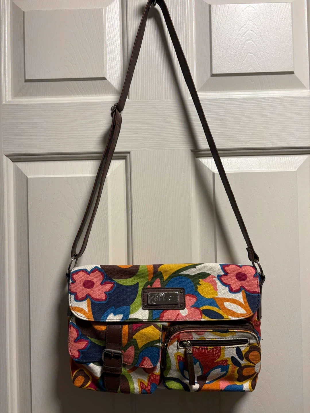 Relic crossbody bag with a vibrant floral print. It features a buckle closure on the front flap and a zippered pocket. It's perfect for adding a pop of colour to your day! The bag is in new condition, never been used! Pick up in Chestermere.