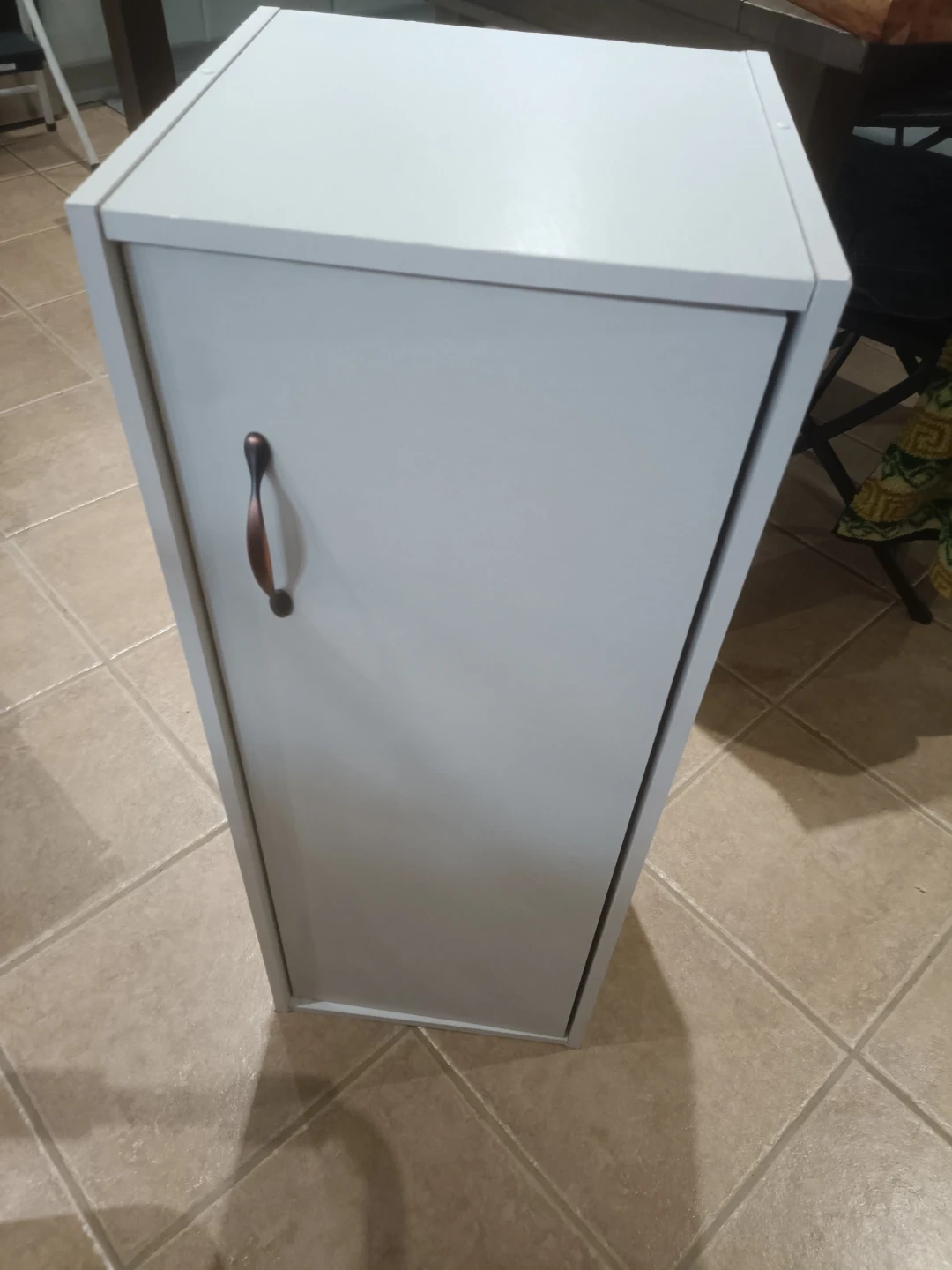 This is a compact white storage cabinet. It has a single door with a bronze handle and opens to reveal three shelves. Perfect for organizing small spaces!