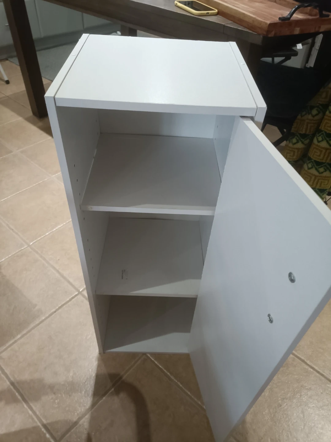 This is a compact white storage cabinet. It has a single door with a bronze handle and opens to reveal three shelves. Perfect for organizing small spaces!