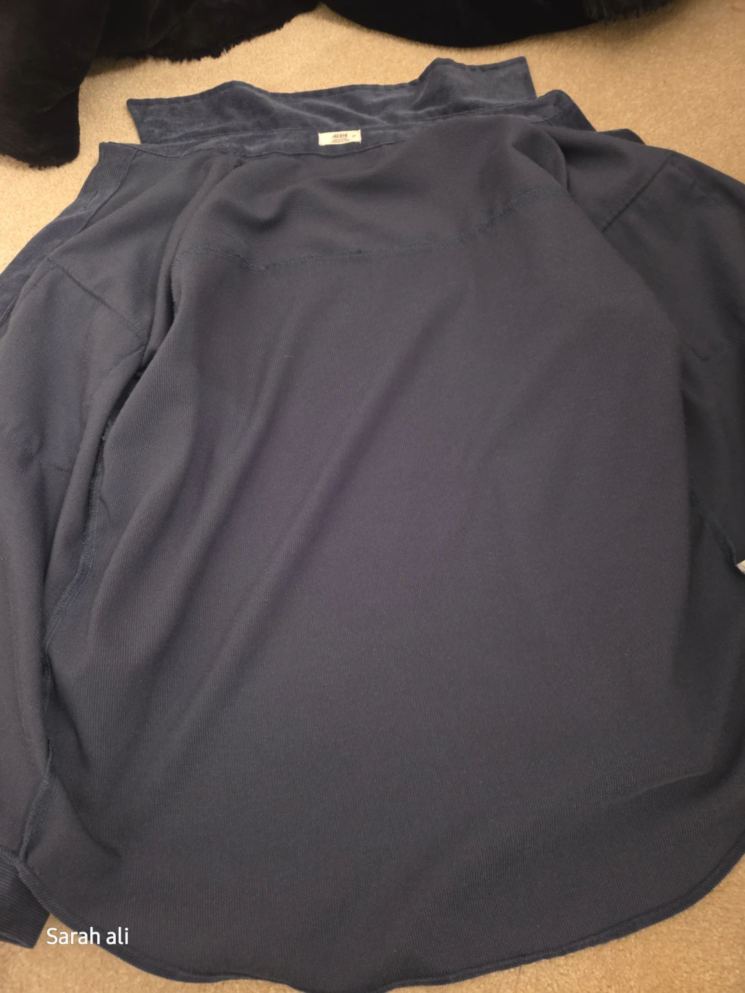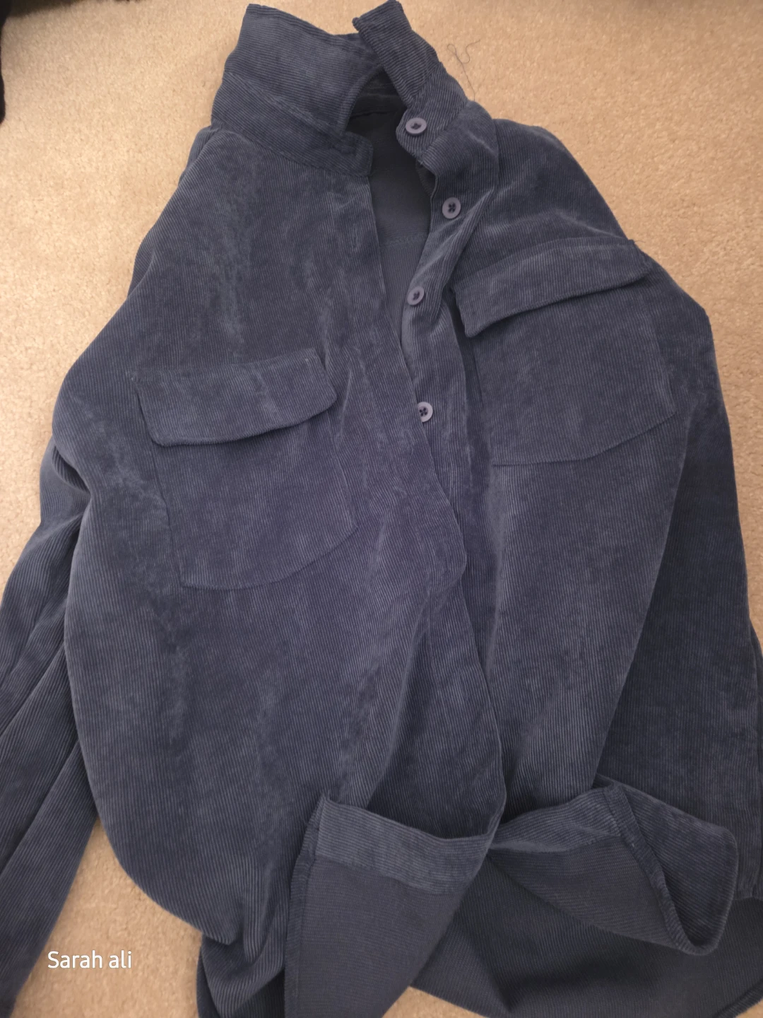 A navy blue corduroy shirt jacket. It's a button-up style with two chest pockets. Made with comfortable corduroy material.