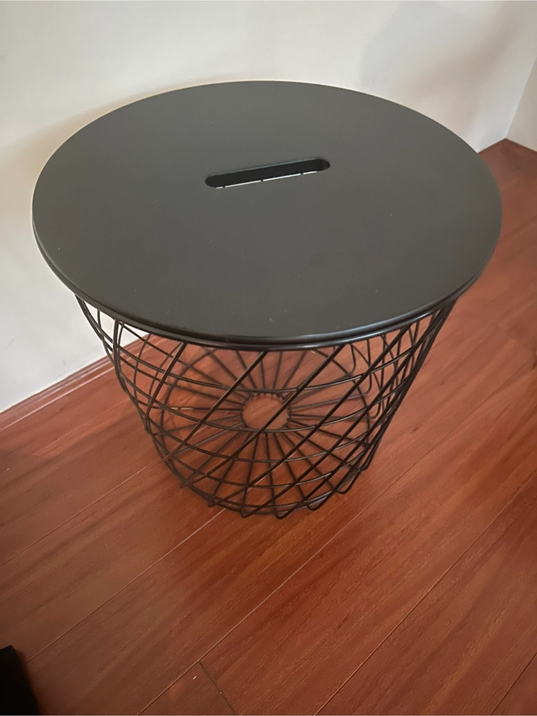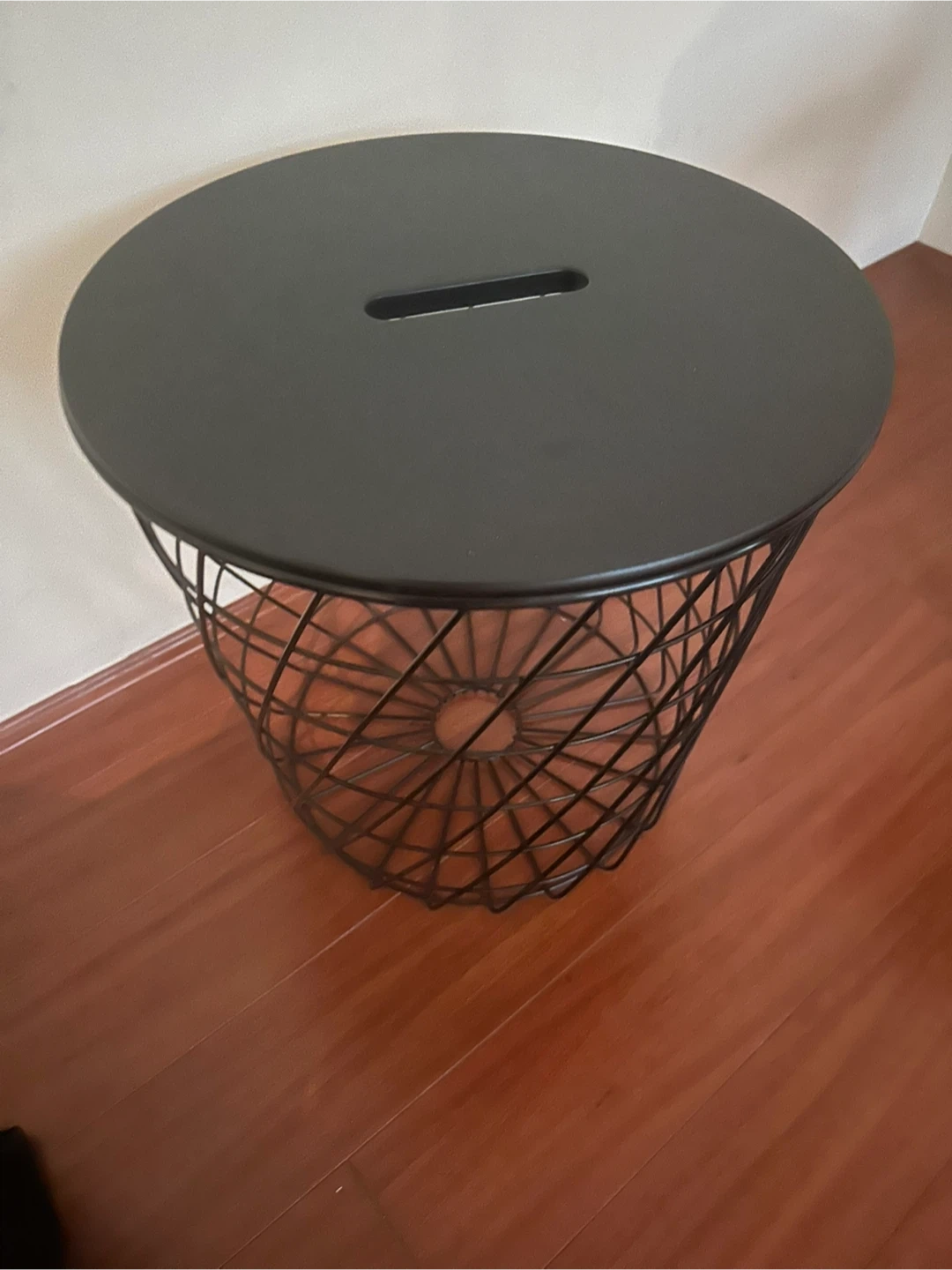 This black wire basket side table features a round lid with a slot. It's a stylish addition for storage or as a small accent table. Wire construction.