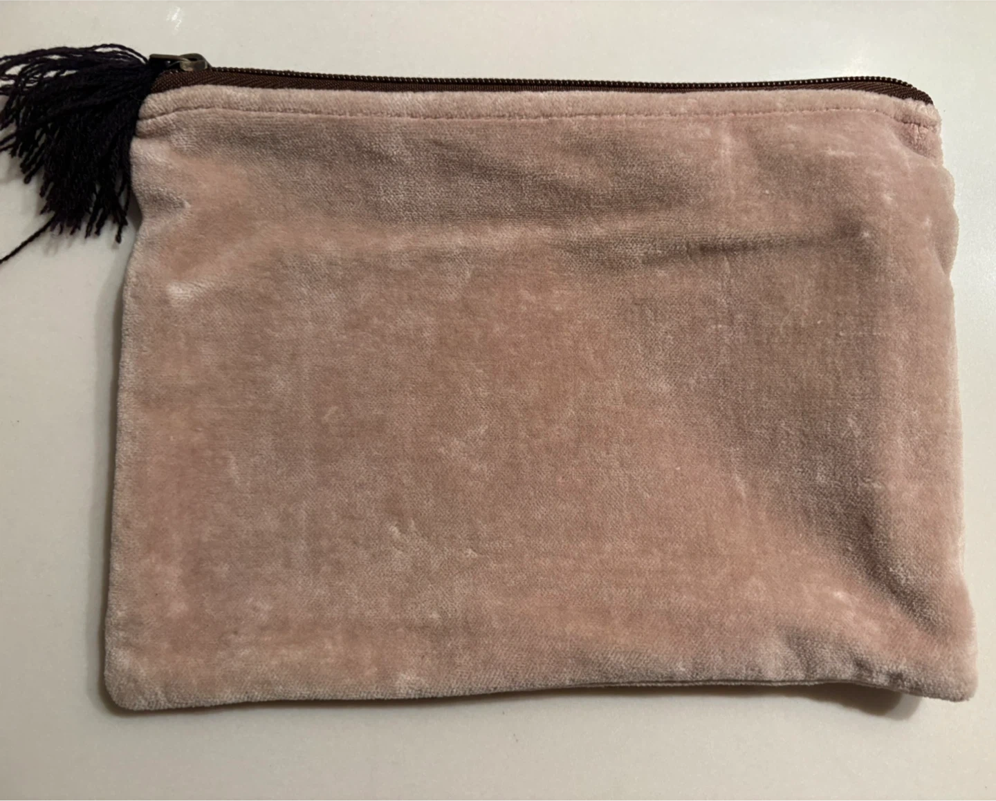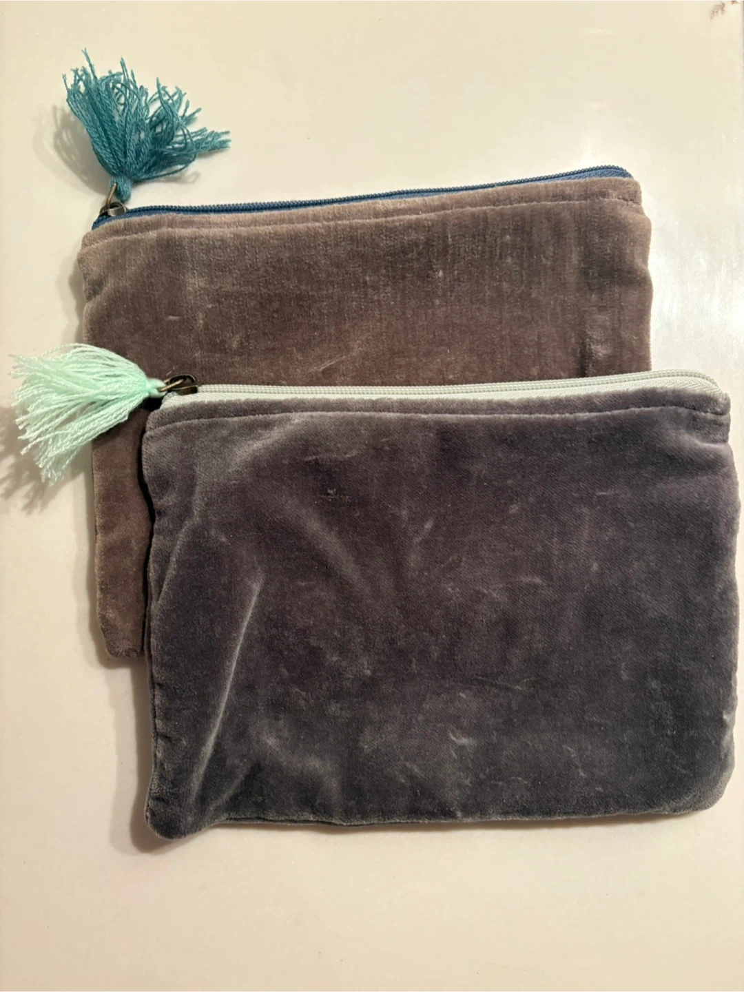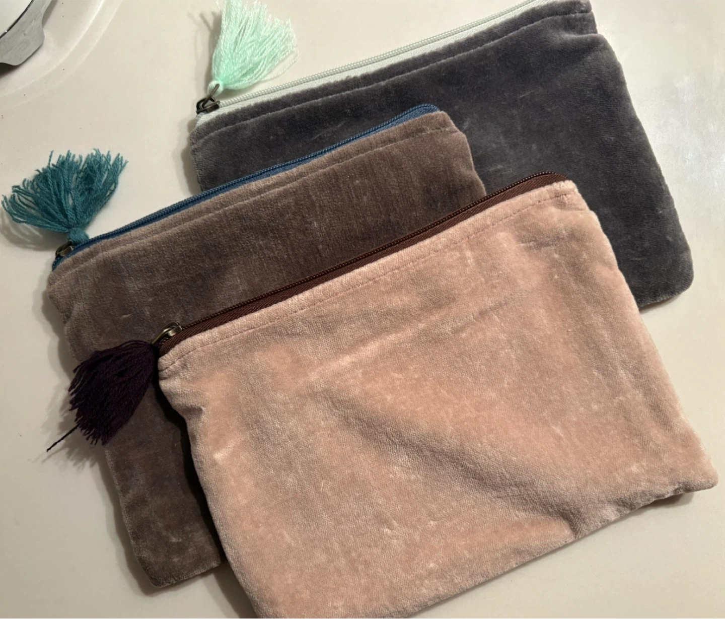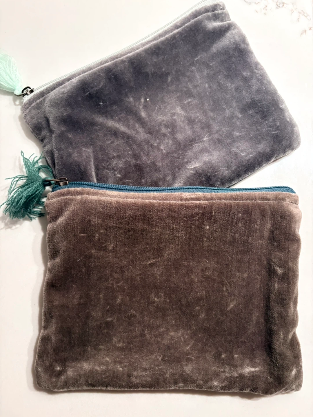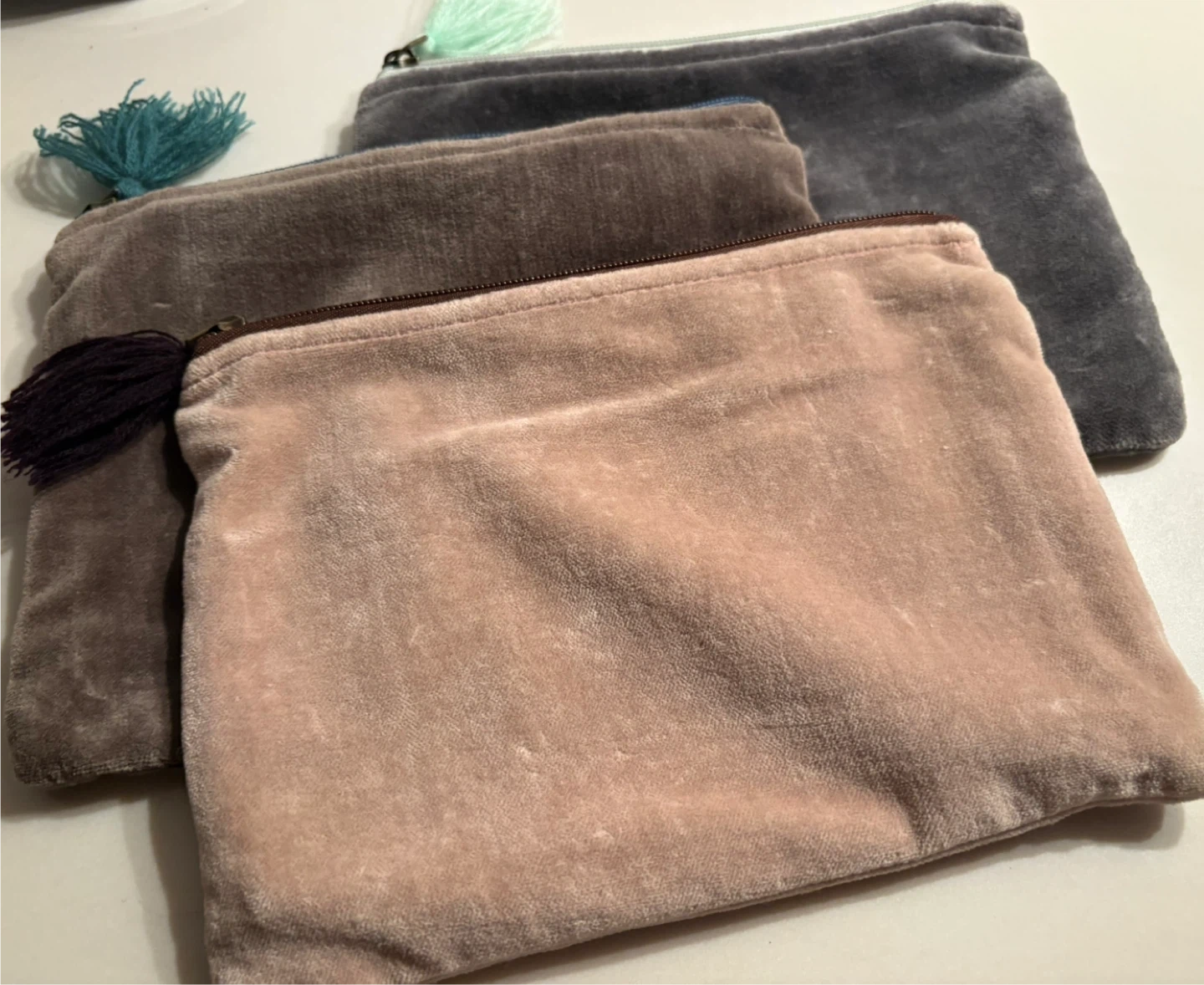 Set of 3 Indaba velvet zipper pouches with tassel zipper pulls. One in light pink, one in mushroom/olive green and one in teal/greyish green.