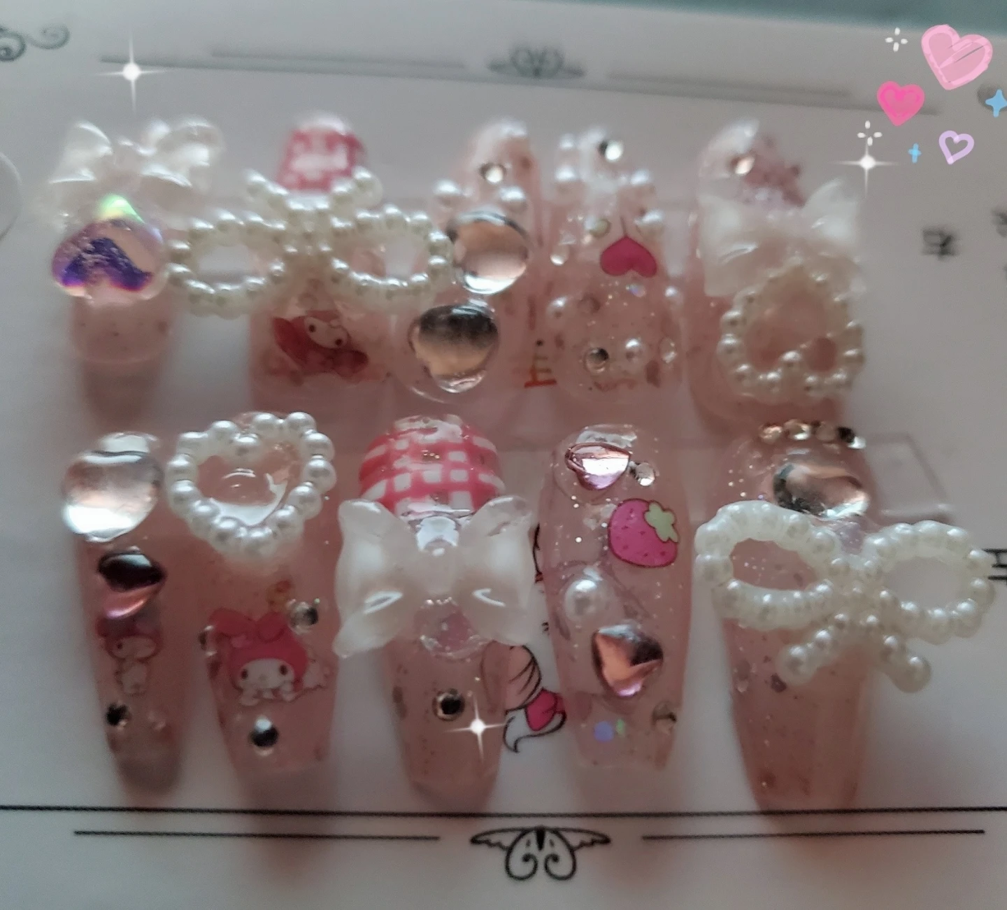 Selling cute sanrio press on nails. They are new, never glued on or worn. Size is 14mm for the thumb, 11mm index finger, 11mm middle finger, 11mm ring finger, 9mm pinky finger. Comes with glue adhesive, nail file, alcohol wipes and a plastic pouch to store the nails in.
