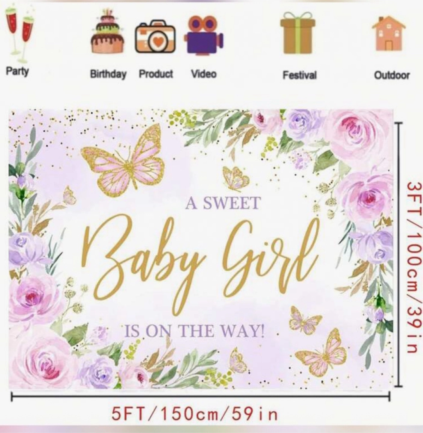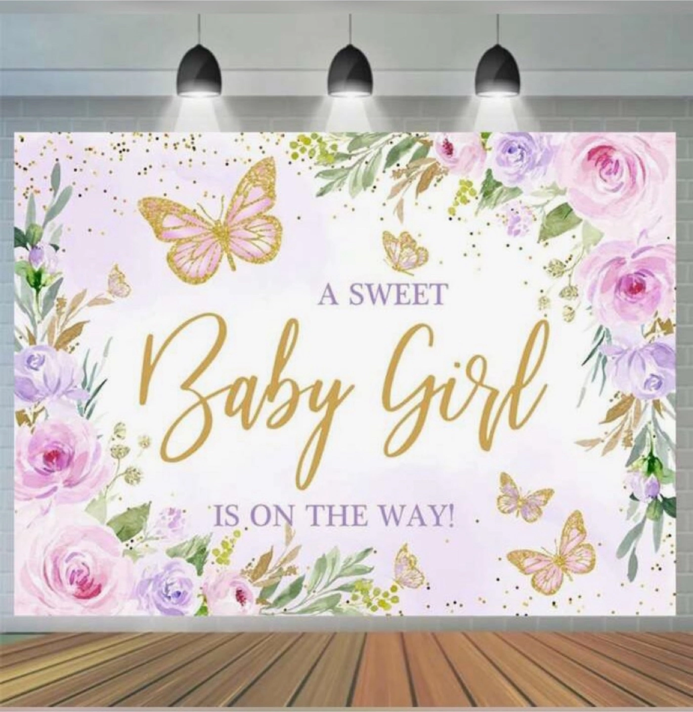 Adorable baby shower backdrop. Features pink and purple floral design, gold butterflies, and the phrase 'A Sweet Baby Girl Is On The Way!'. Perfect for photos. 5ft x 3ft.