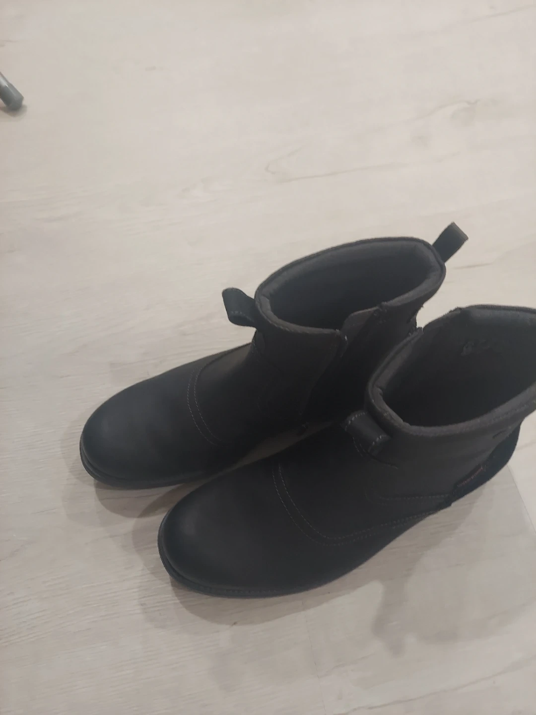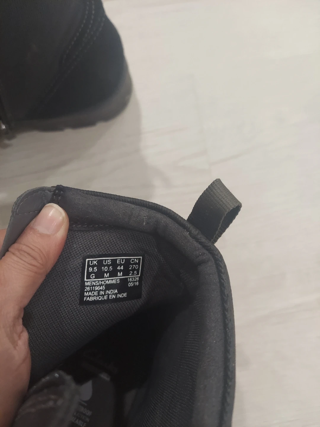 These Clarks ankle boots are made of black leather. They feature a side zip closure and pull tabs for easy on and off. The EU size is 44 and the US size is 10.5.