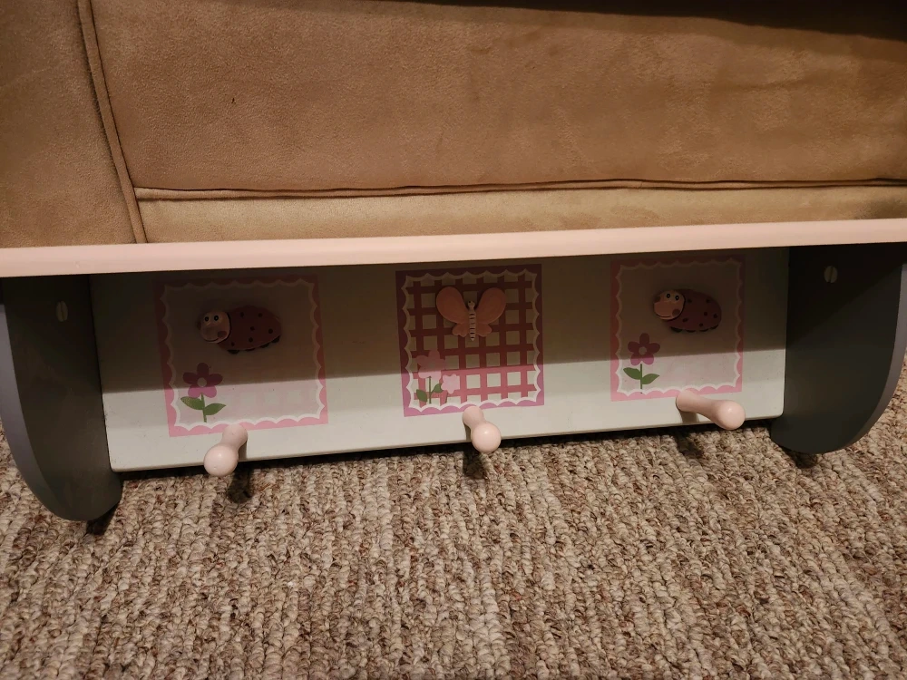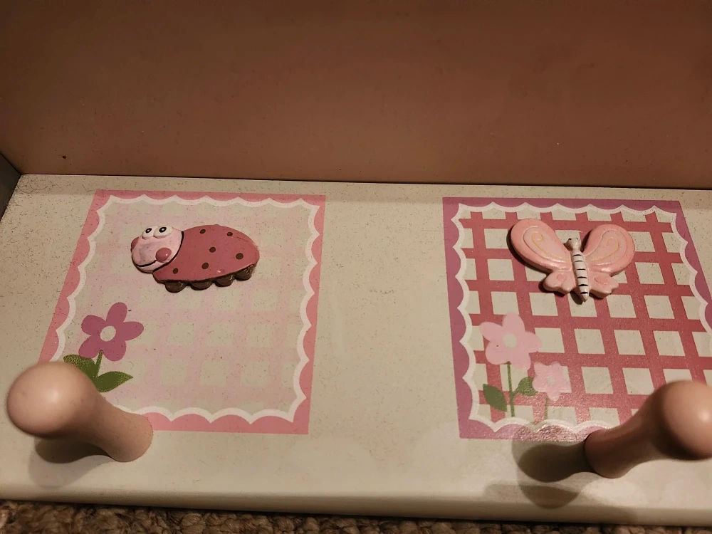 Here's a cute wall shelf perfect for a kid's room! It features three hooks and adorable ladybug and butterfly designs. Pink/ gray color. It's in great condition and ready to add a touch of charm to any space