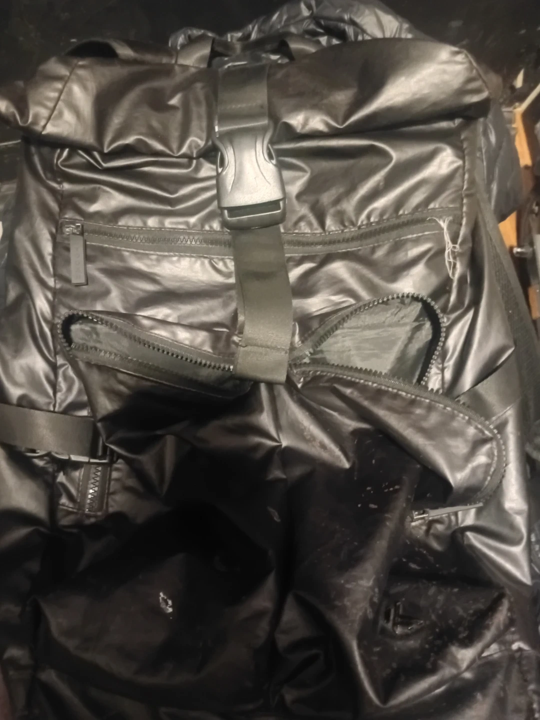 This Kyoban backpack is black with a roll-top closure. It features multiple zippered pockets for organization. The backpack is water-resistant. It's a great bag for daily commutes or weekend trips!