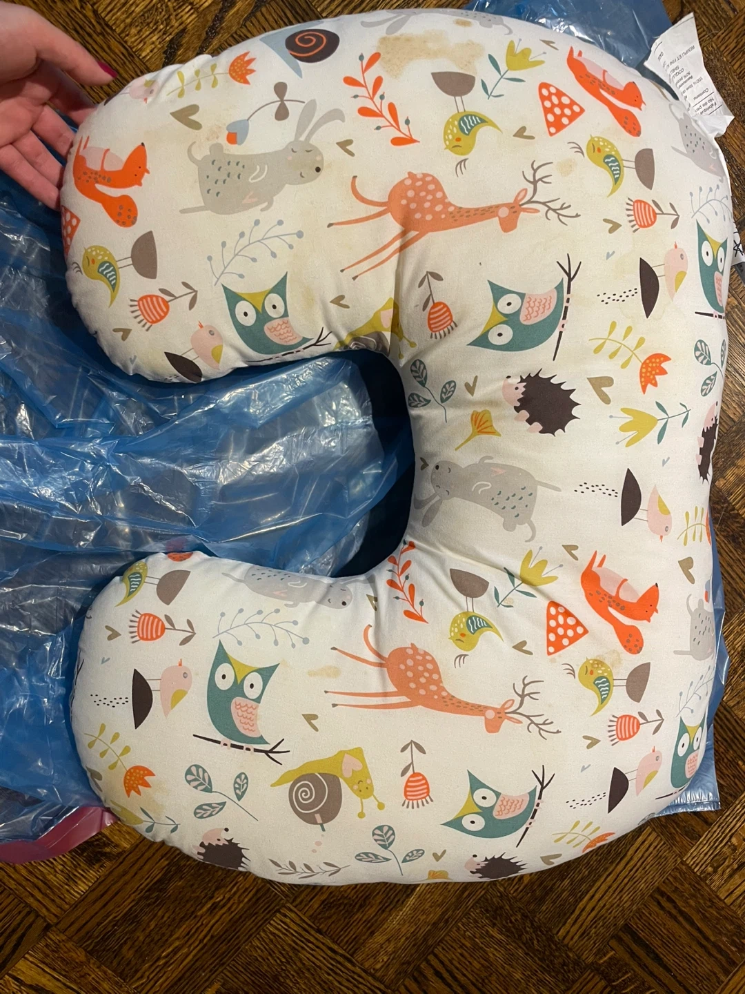 Selling a Boppy pillow with a cute animal print! It's perfect for nursing support and keeping your little one comfy. It does have some signs of use, as you can see in the photos.