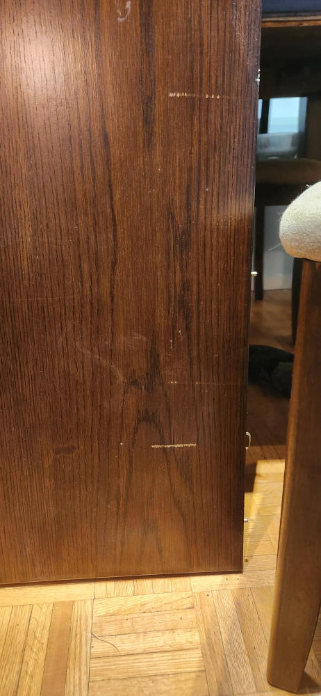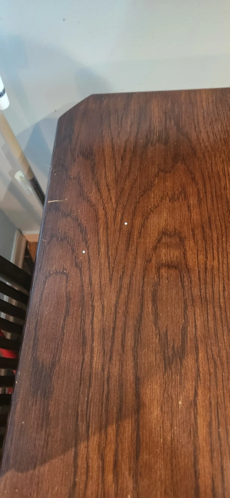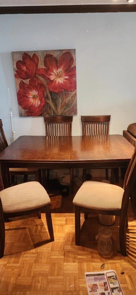 Large, dark brown wooden dining table. Seats six comfortably. Extends for extra space. Minor scratches and wear. Includes six matching chairs with beige fabric seats. Good condition, scratches shown in pictures.