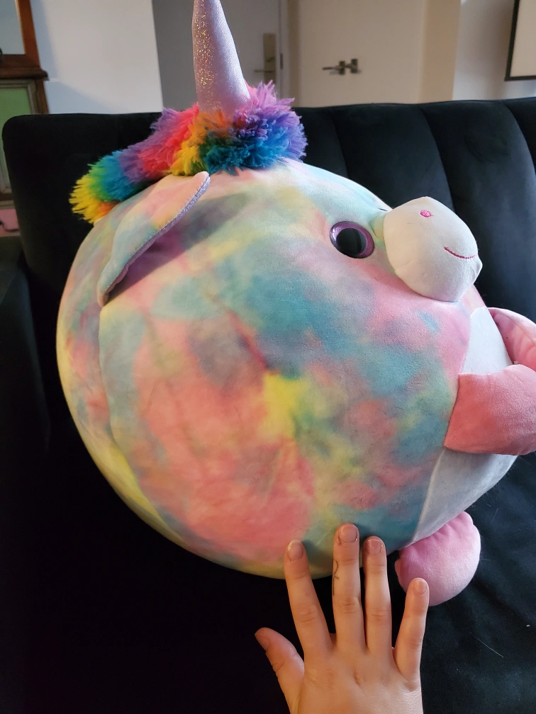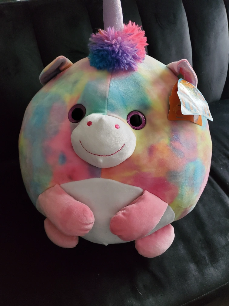 A wonderful stuffy we though the cats would enjoy snuggling but they do not so this stuffy deserves a better forever home! ❤️ Good as a small ottoman in a kids room, a snuggle buddy, or a cute display stuffy. Multi-colored and soft.