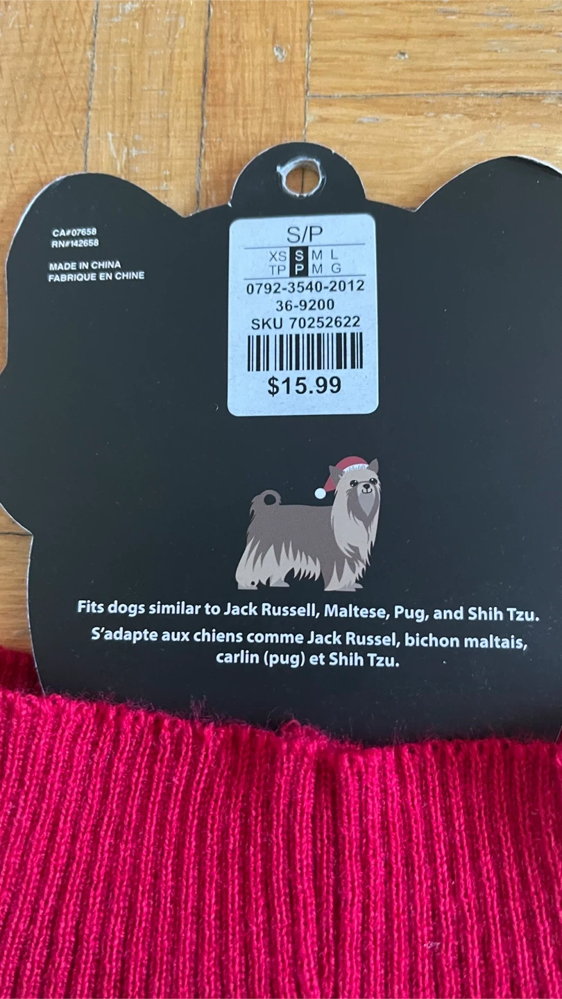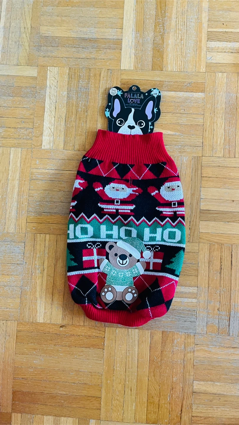 This is a festive dog sweater with a Christmas theme. It's designed with Santa and a bear graphic. It fits dogs similar to Jack Russell, Maltese, Pug, and Shih Tzu breeds.