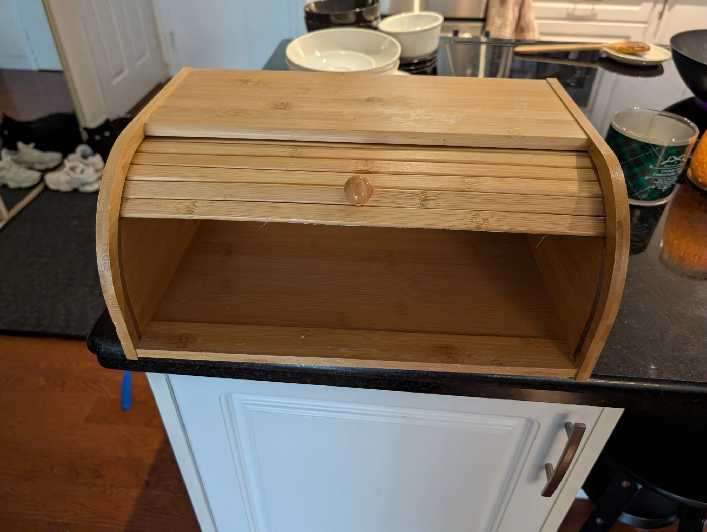 Here's a bamboo bread box to keep your bread fresh and organized! It's in great shape and ready for a new home and many plates