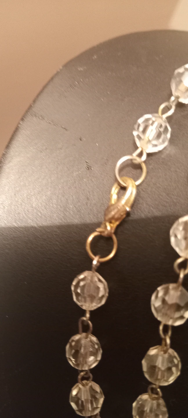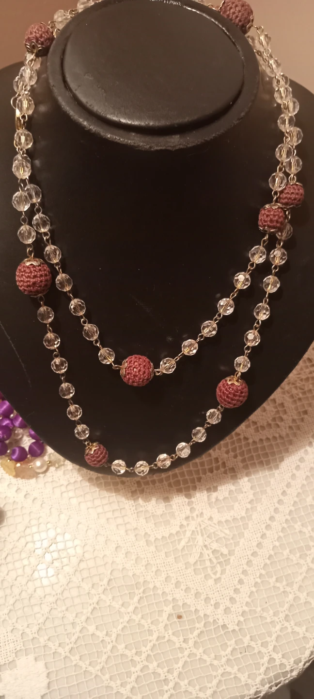 This is a stylish double strand necklace. It features clear faceted beads alternating with small brown crocheted beads. The closure is a lobster clasp.