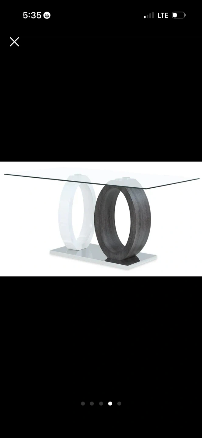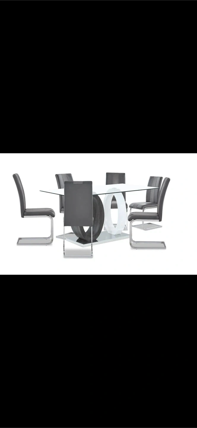 Selling a modern glass dining table with six chairs. The table features a sleek glass top and a sturdy base. The chairs are upholstered in a dark grey material with a chrome frame. It's a great set for any dining space! For the brick furniture.