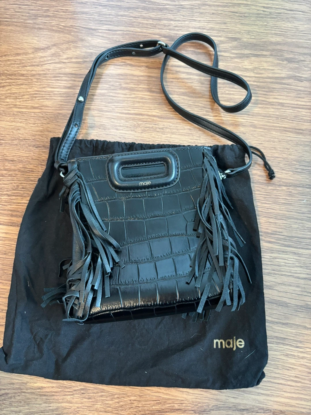 Check out this super stylish Maje handbag! It's black leather with a unique crocodile texture and fun fringe detailing. Comes with its original dust bag, so it's ready to go!