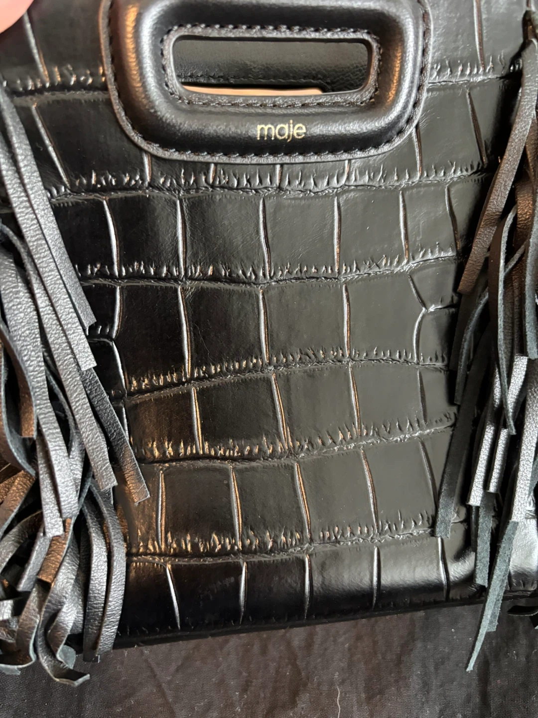 Check out this super stylish Maje handbag! It's black leather with a unique crocodile texture and fun fringe detailing. Comes with its original dust bag, so it's ready to go!