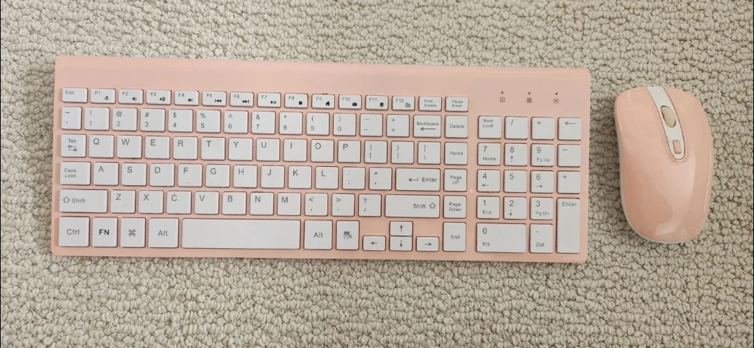 Pink wireless keyboard and mouse set. Slim, compact design, perfect for a clean desk setup. The keys are quiet and responsive for comfortable typing.