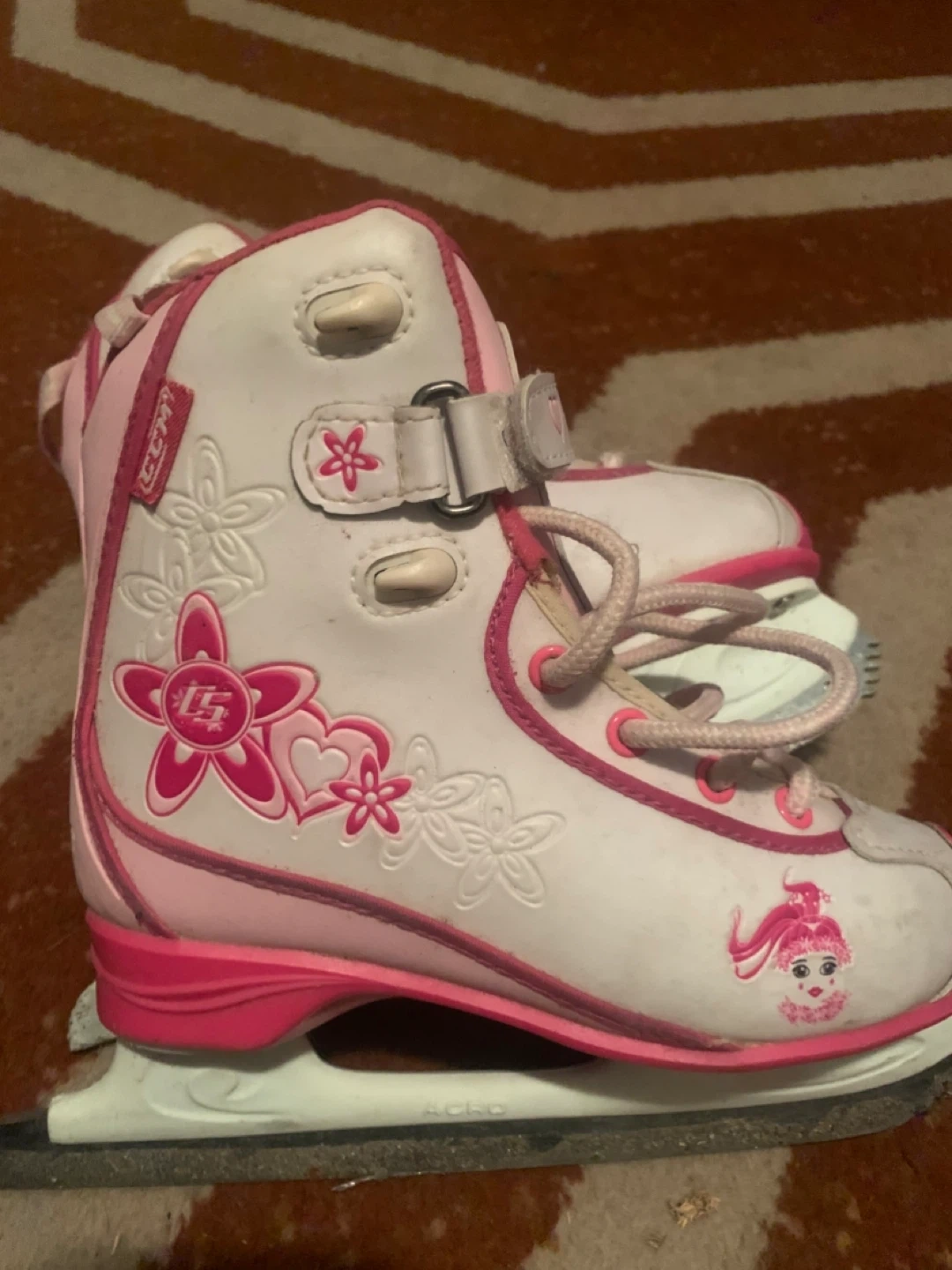 White and pink CCM figure skates for girls. They feature colourful floral and character decals on the sides. The skates have a secure lace-up closure with an additional velcro strap for ankle support. Blades appear to be in decent condition.