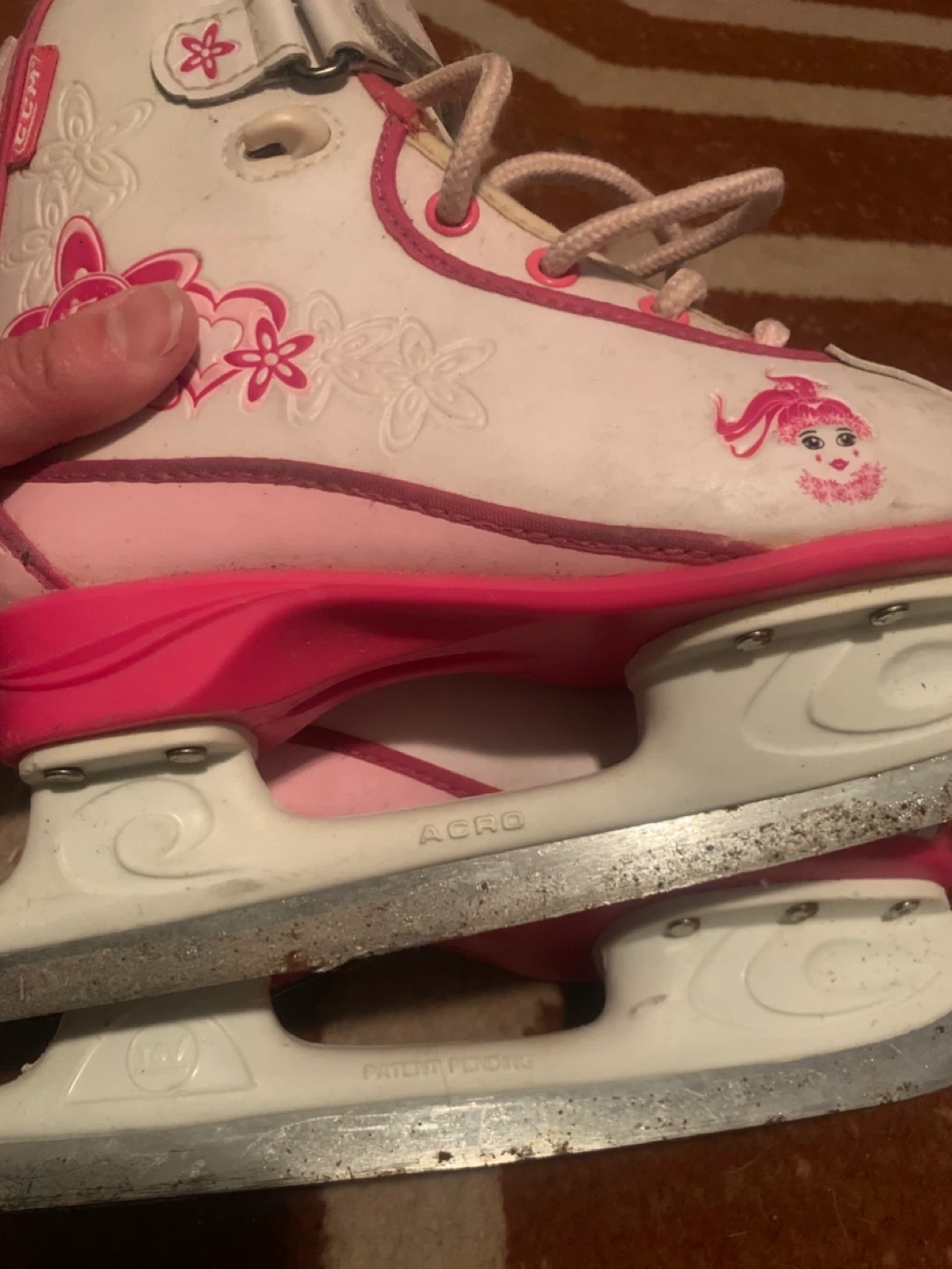 White and pink CCM figure skates for girls. They feature colourful floral and character decals on the sides. The skates have a secure lace-up closure with an additional velcro strap for ankle support. Blades appear to be in decent condition.