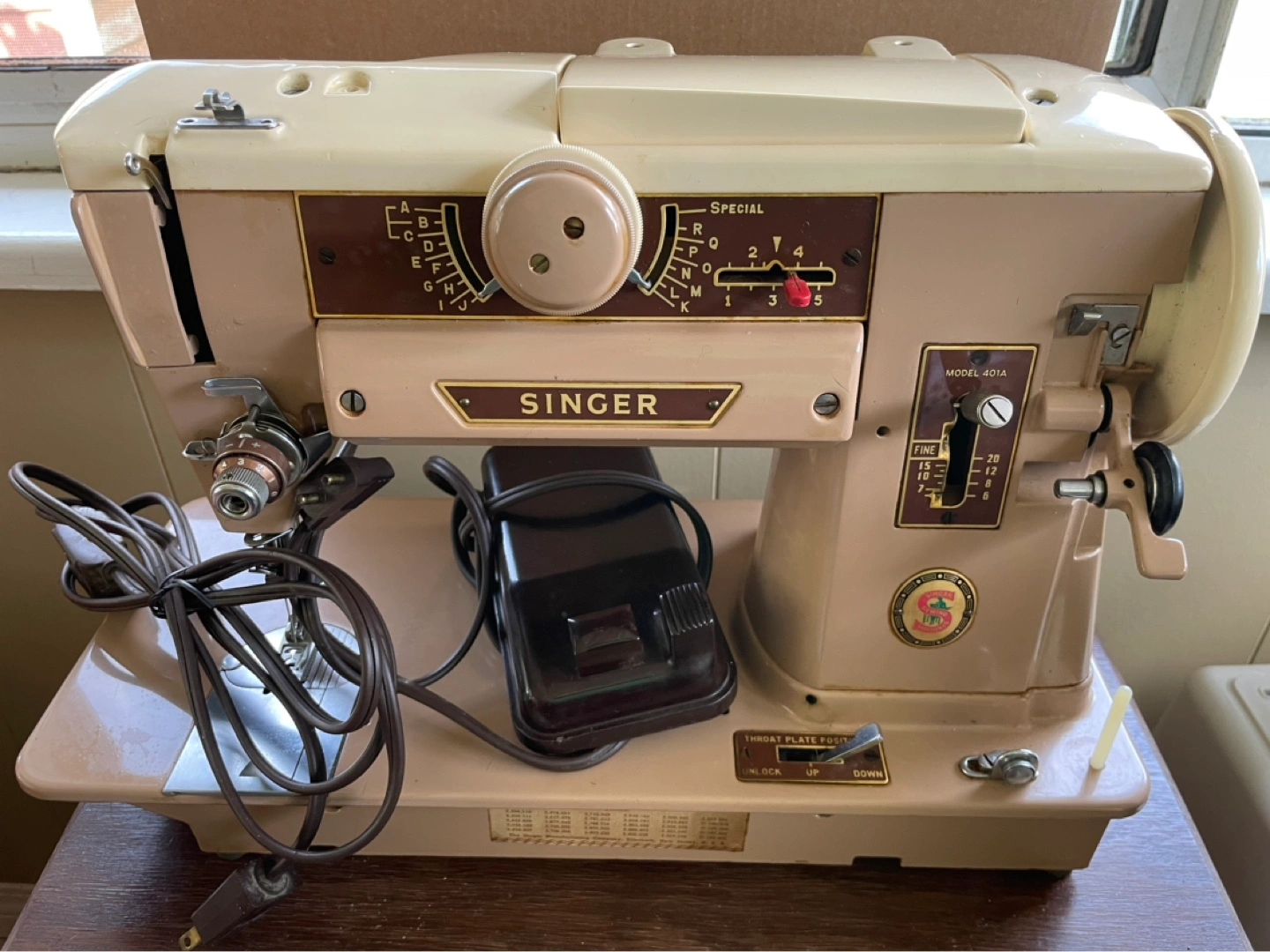 Vintage Singer sewing machine. Model 601A. Beige and brown colour. Includes foot pedal and power cord. Great for collectors or sewing enthusiasts.