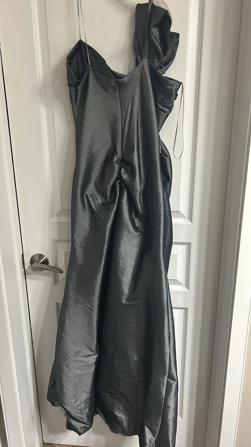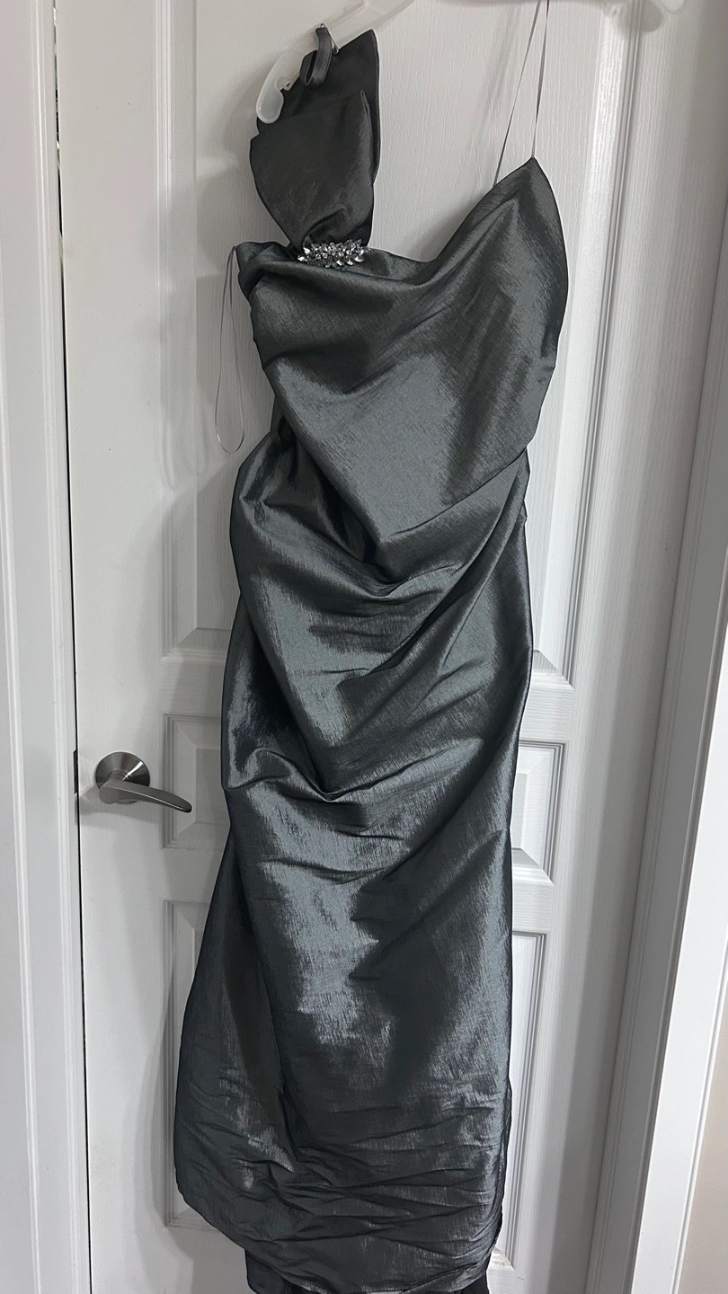 Elegant floor-length gown. One-shoulder design. Draped taffeta fabric. Features a crystal embellishment. Perfect for formal events.