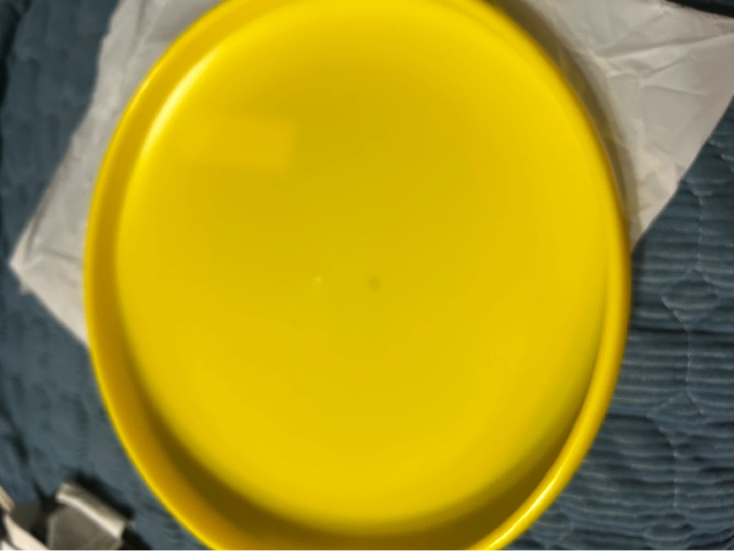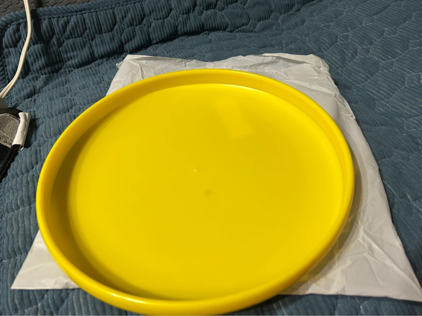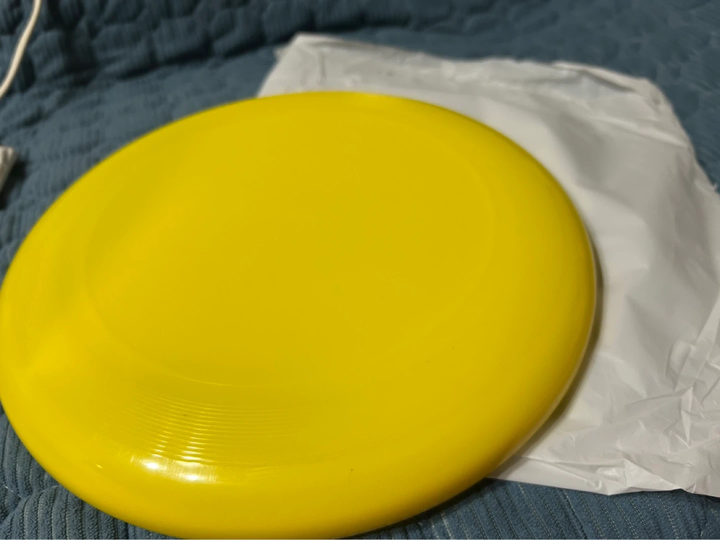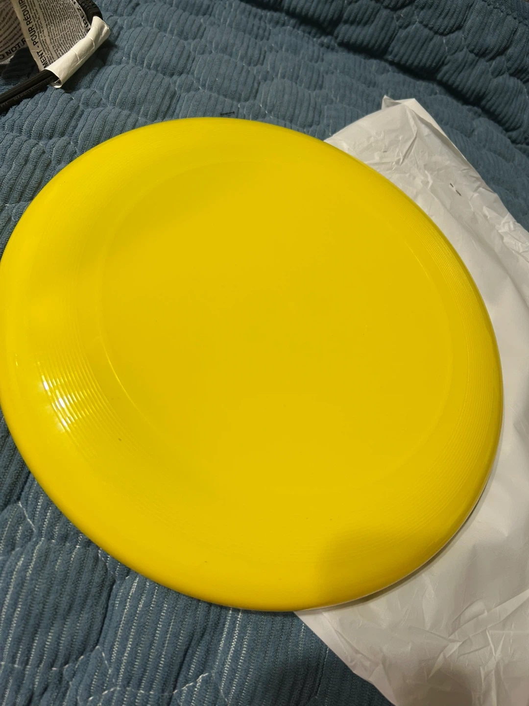 This new yellow flying disc is great for outdoor play. It's made of durable plastic. Perfect for a day at the park or beach!