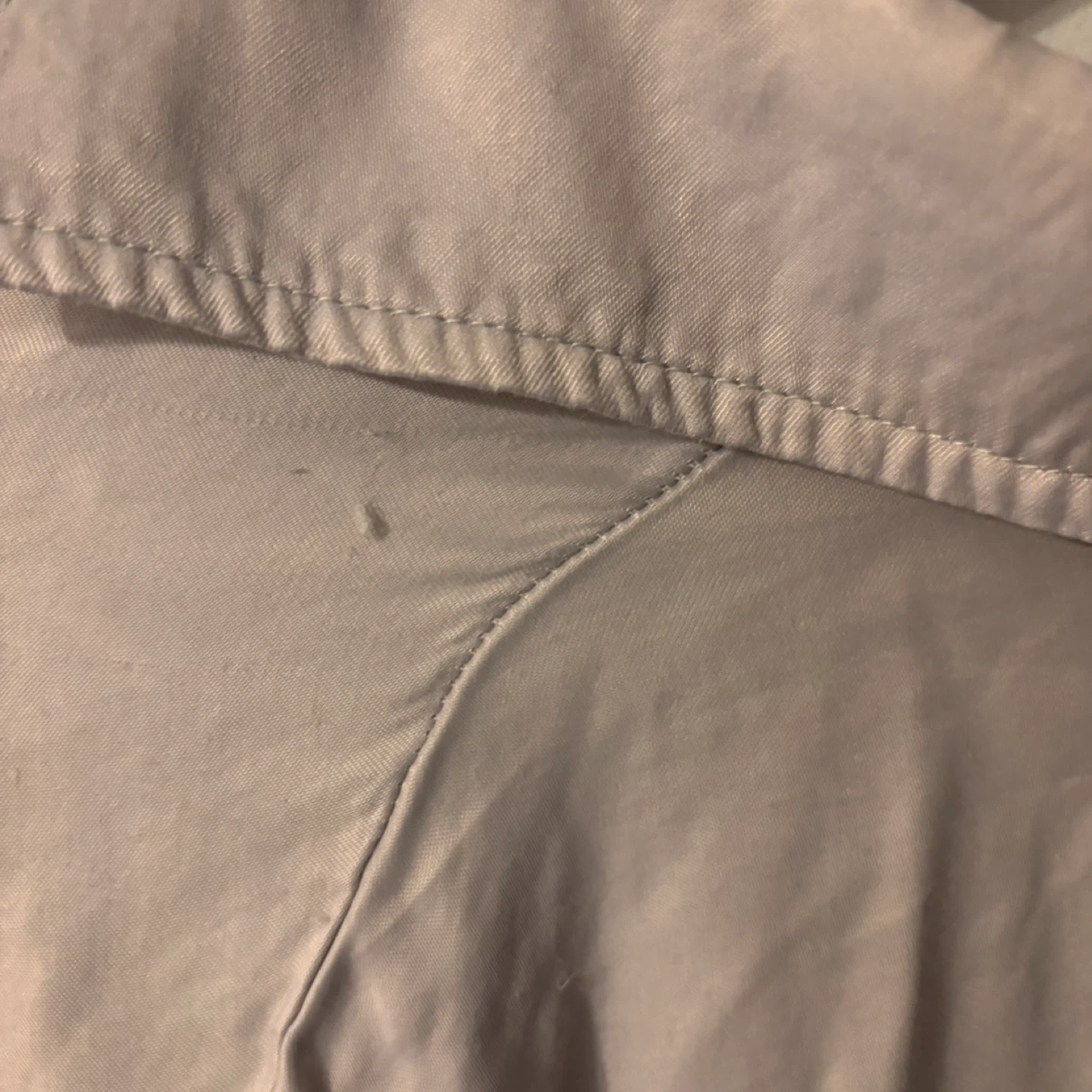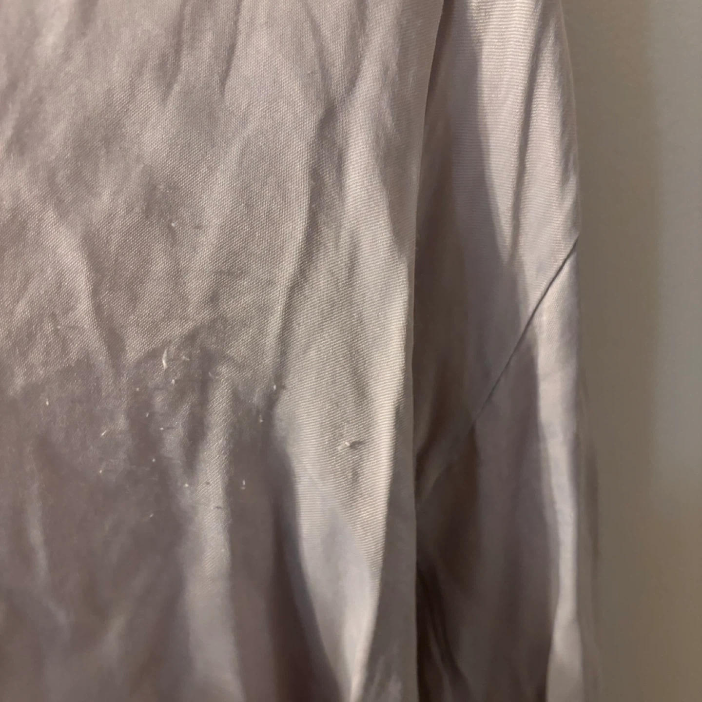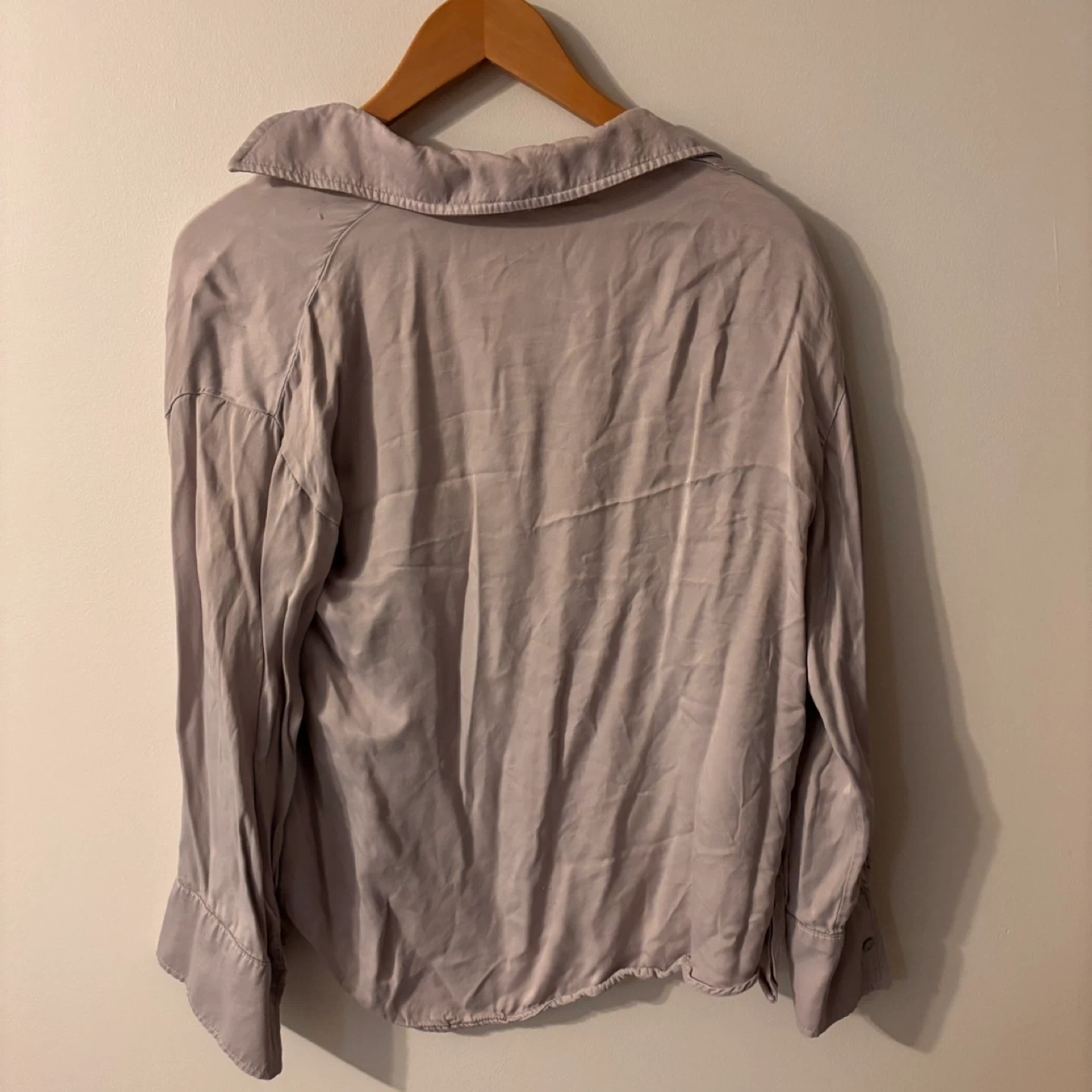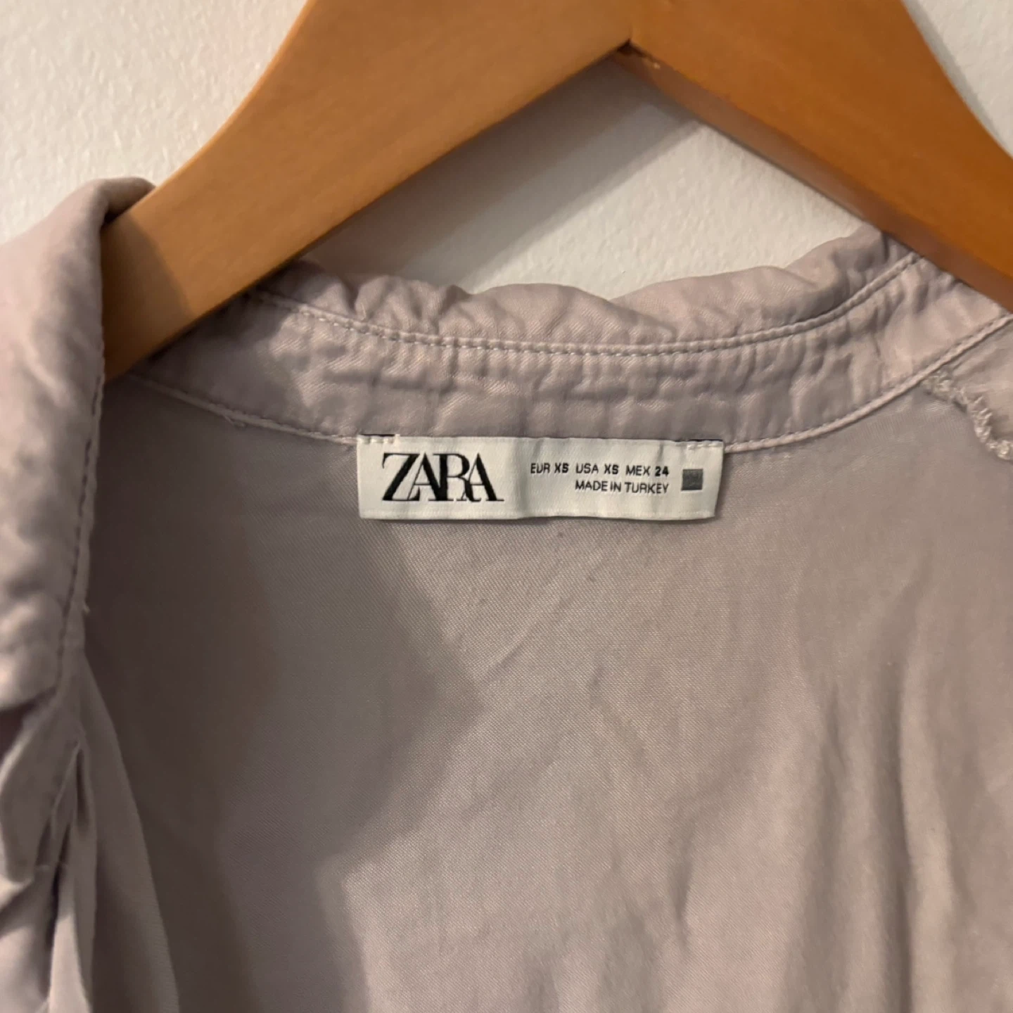 This is a Zara women's button-up shirt. It's a size XS in a light lilac colour. The fabric is lightweight and has a smooth feel.