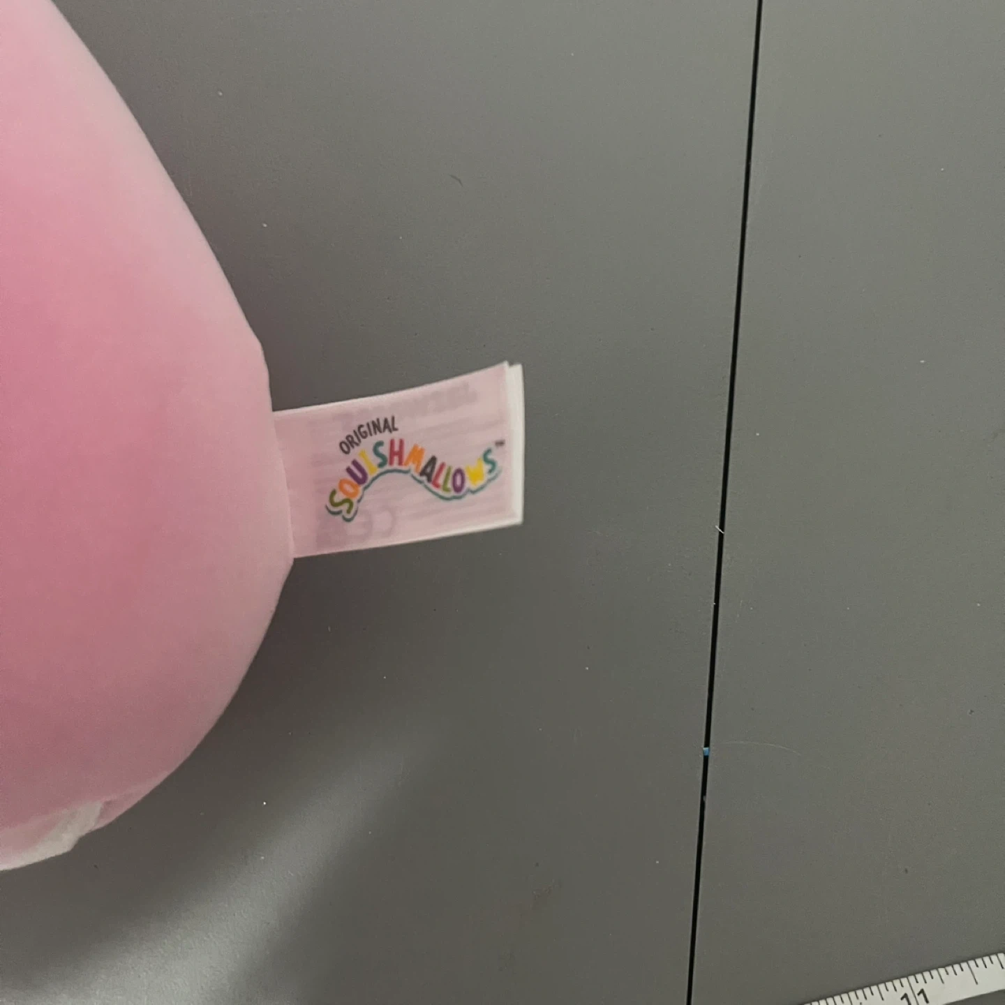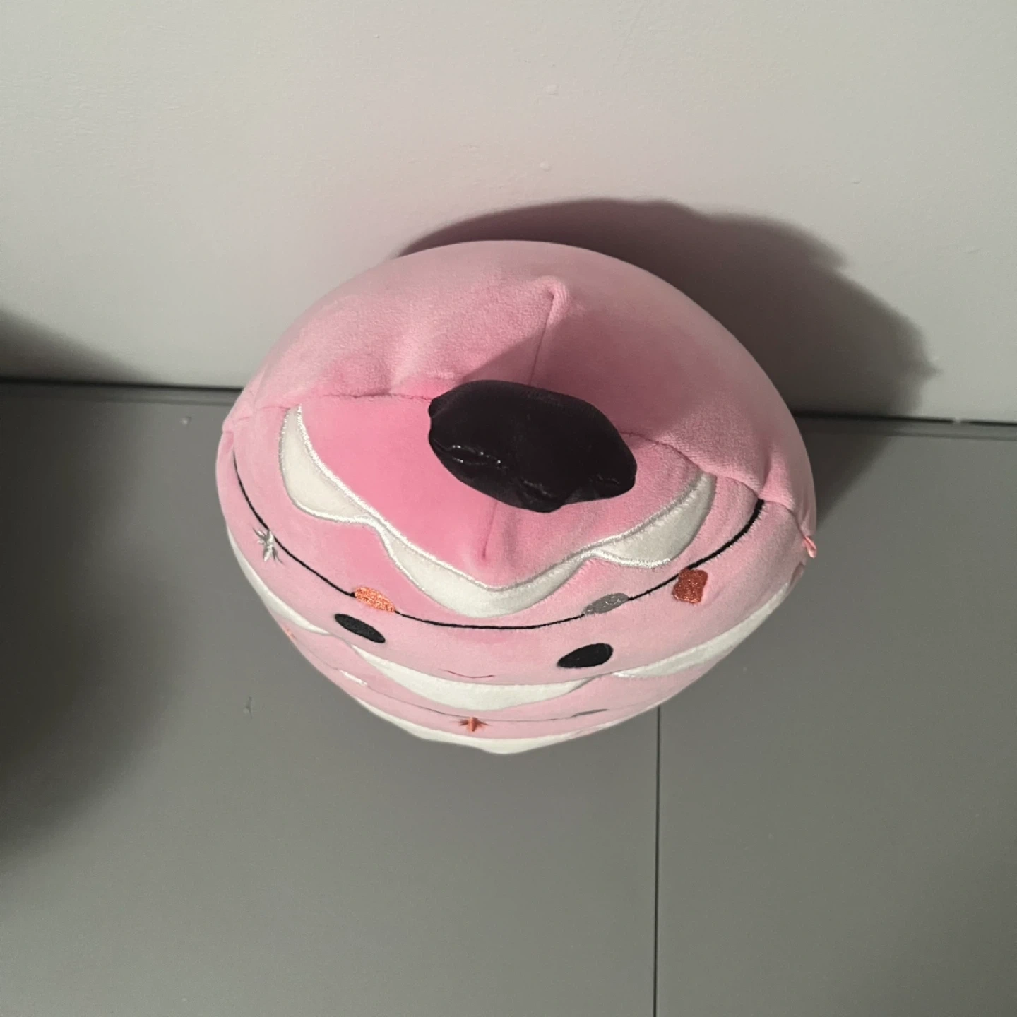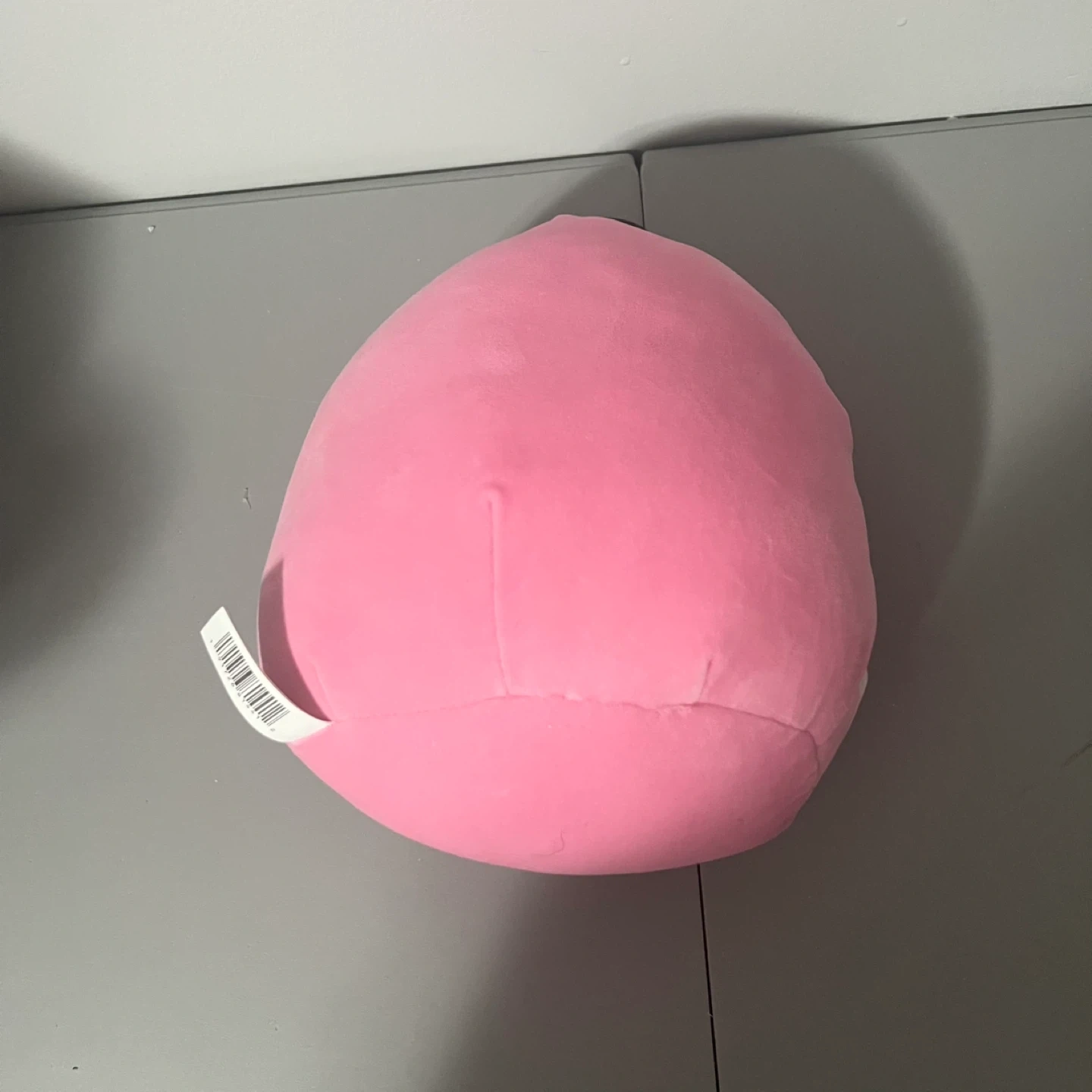 Soft, plush pink ornament-shaped Squishmallow. Features a cute embroidered face and string lights design. It's made of polyester material.