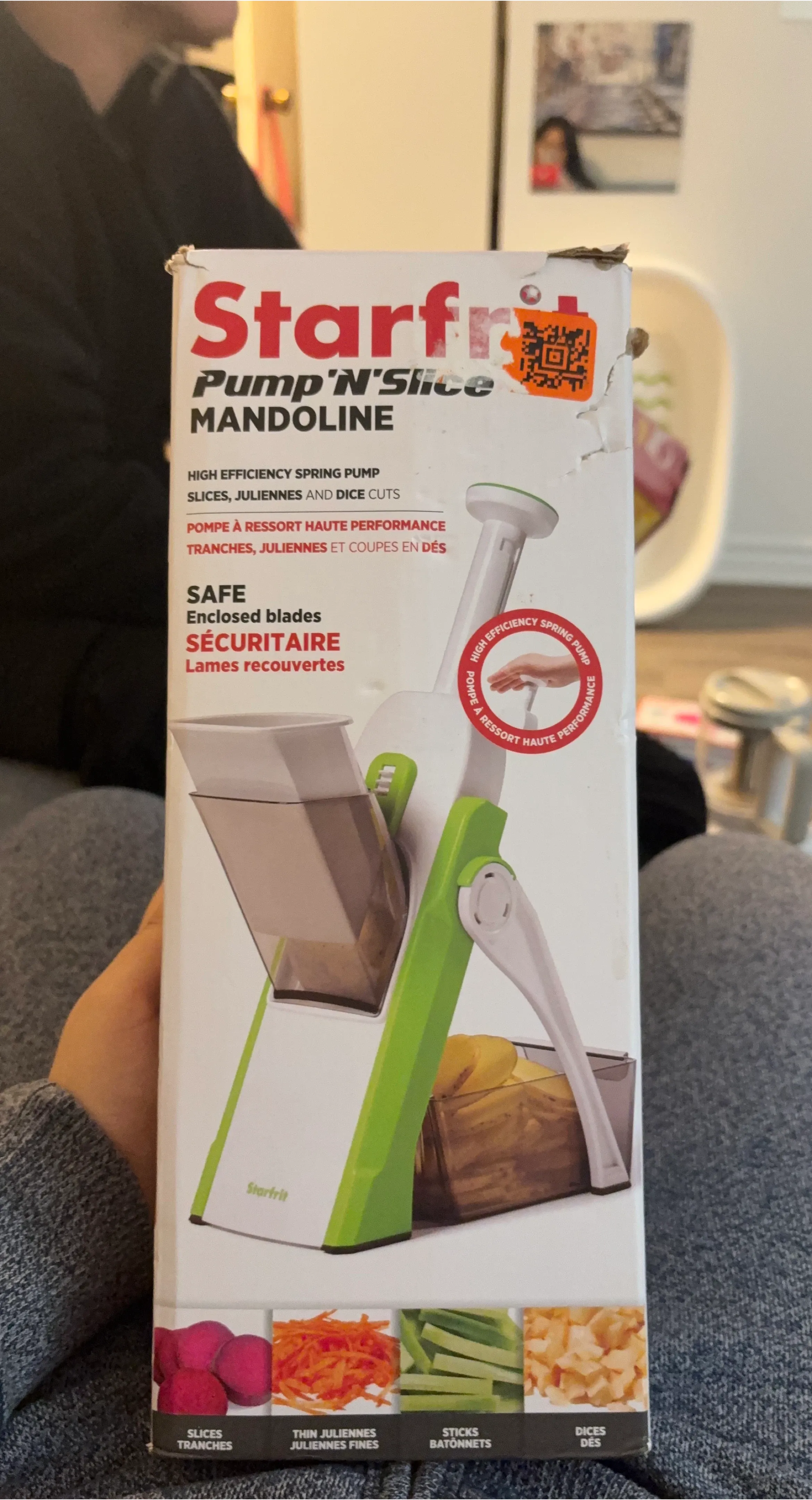 Selling a Starfrit Pump 'N' Slice Mandoline! It features a high-efficiency spring pump for easy slicing, julienning, and dicing. The enclosed blades ensure safety while you're prepping your veggies. Get ready to make quick and easy meals!