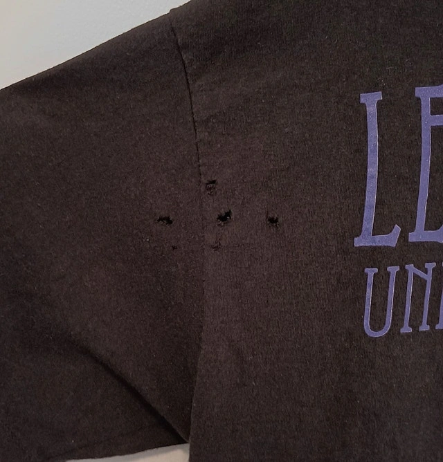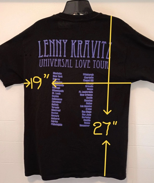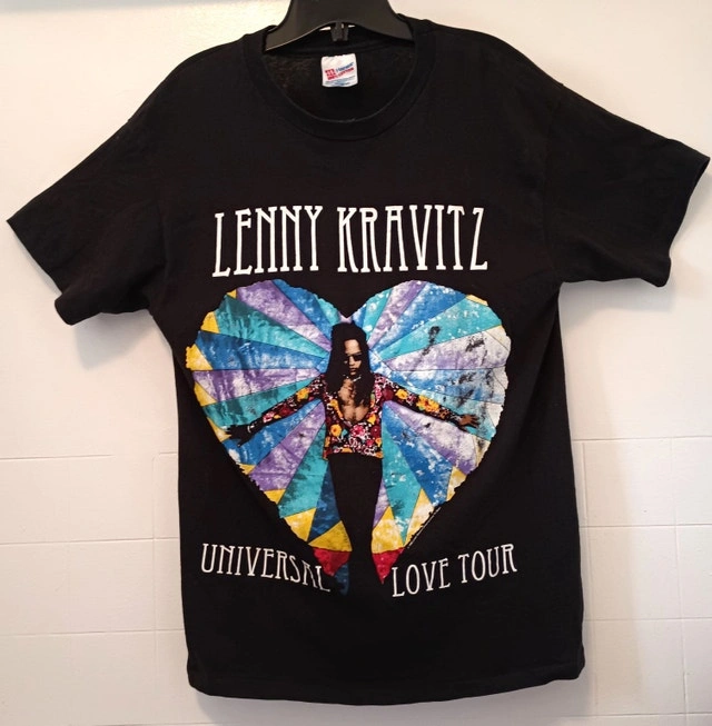 Authentic vintage Lenny Kravitz Universal Love Tour 1993 T-Shirt with North American locations on back. All pictures are of the actual shirt for sale, please see pictures for condition and measurements. Some wear on front print, black with minimal fading, a few small holes on back of left shoulder. Hanes 100% cotton. Available at safe, public meet-up in downtown Kitchener. Cash accepted.