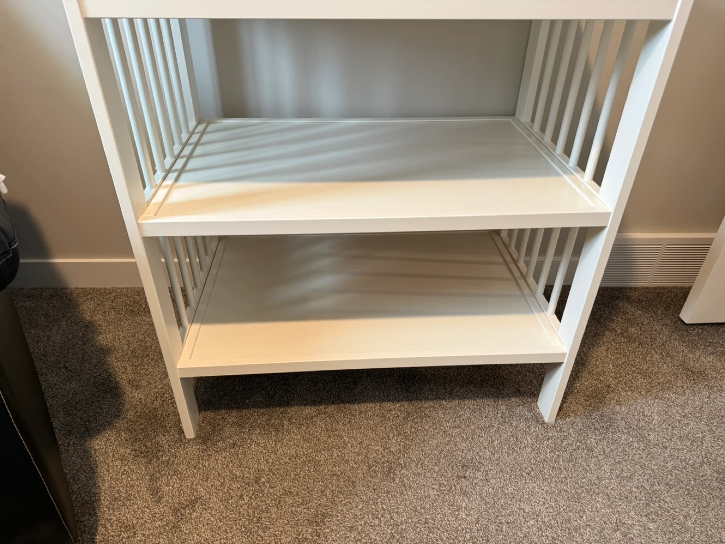 White IKEA Changeling changing table. It has two open shelves for storage. Includes changing mat. Minor scuff marks visible on the side.