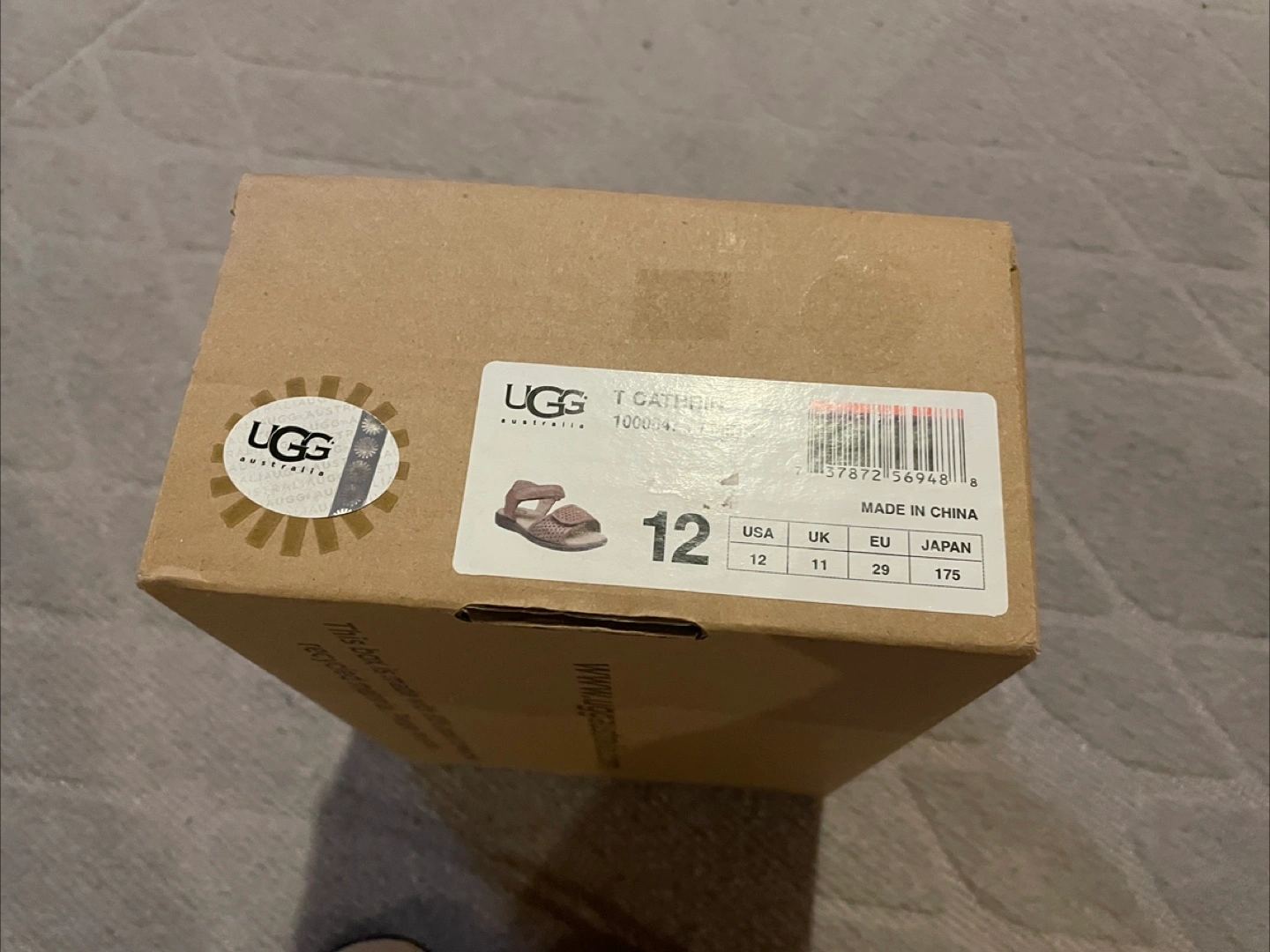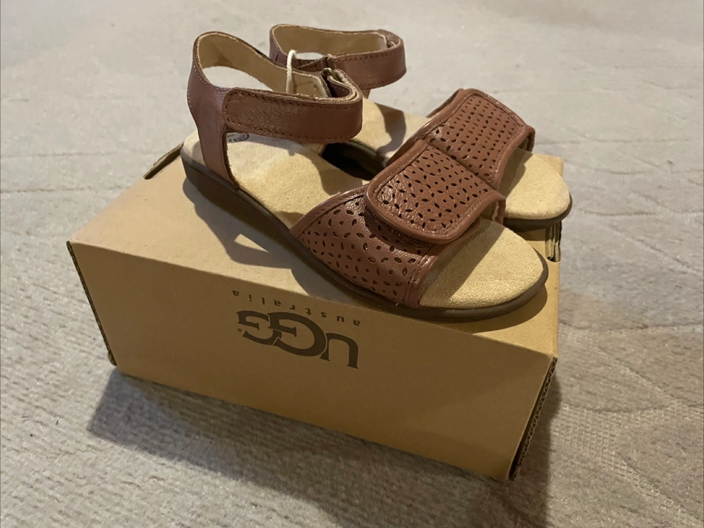 Cute brown leather sandals. Size 12. Brand New. Perforated detailing. Adjustable ankle strap. Comes in original UGG box.