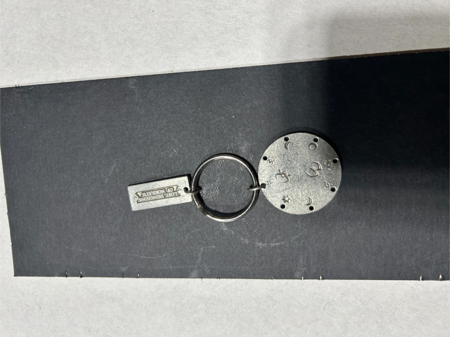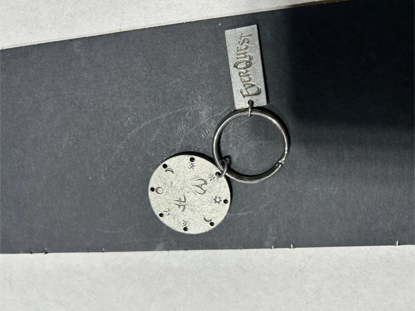 This metal keychain features the EverQuest logo on one tag and symbols from the Lost Dungeons of Norrath expansion on a circular charm. It's attached to a standard split ring. Perfect for any EverQuest fan!