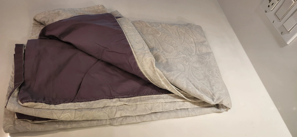 Selling a gently used comforter with a lovely purple and grey pattern. It's in good condition with working zipper closure.