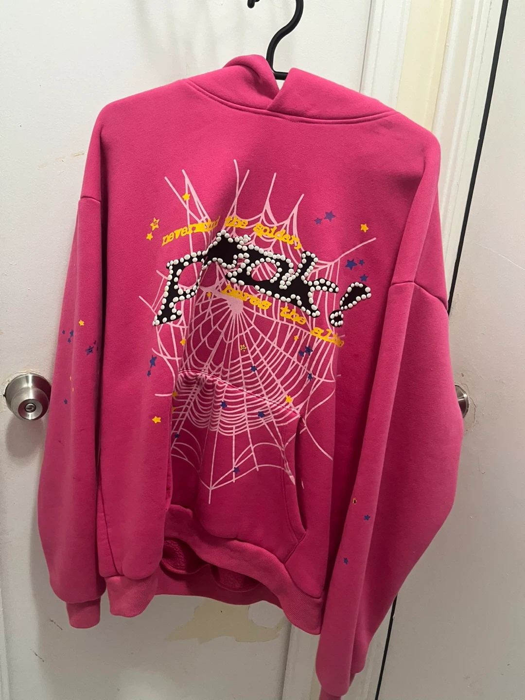 Selling a vibrant pink Sp5der hoodie in size XL! It features a unique design with a spiderweb and star logo. The hoodie is made of 100% cotton, ensuring a comfy and cozy fit. Perfect for adding a pop of colour to your wardrobe!