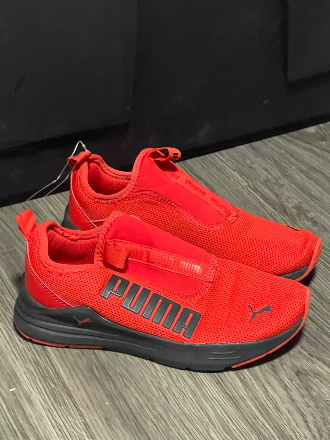 These red Puma athletic shoes feature a slip-on design for easy wear. The mesh upper provides breathability. Includes PUMA branding on the side and tongue.