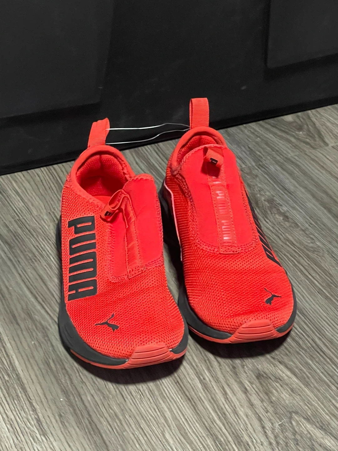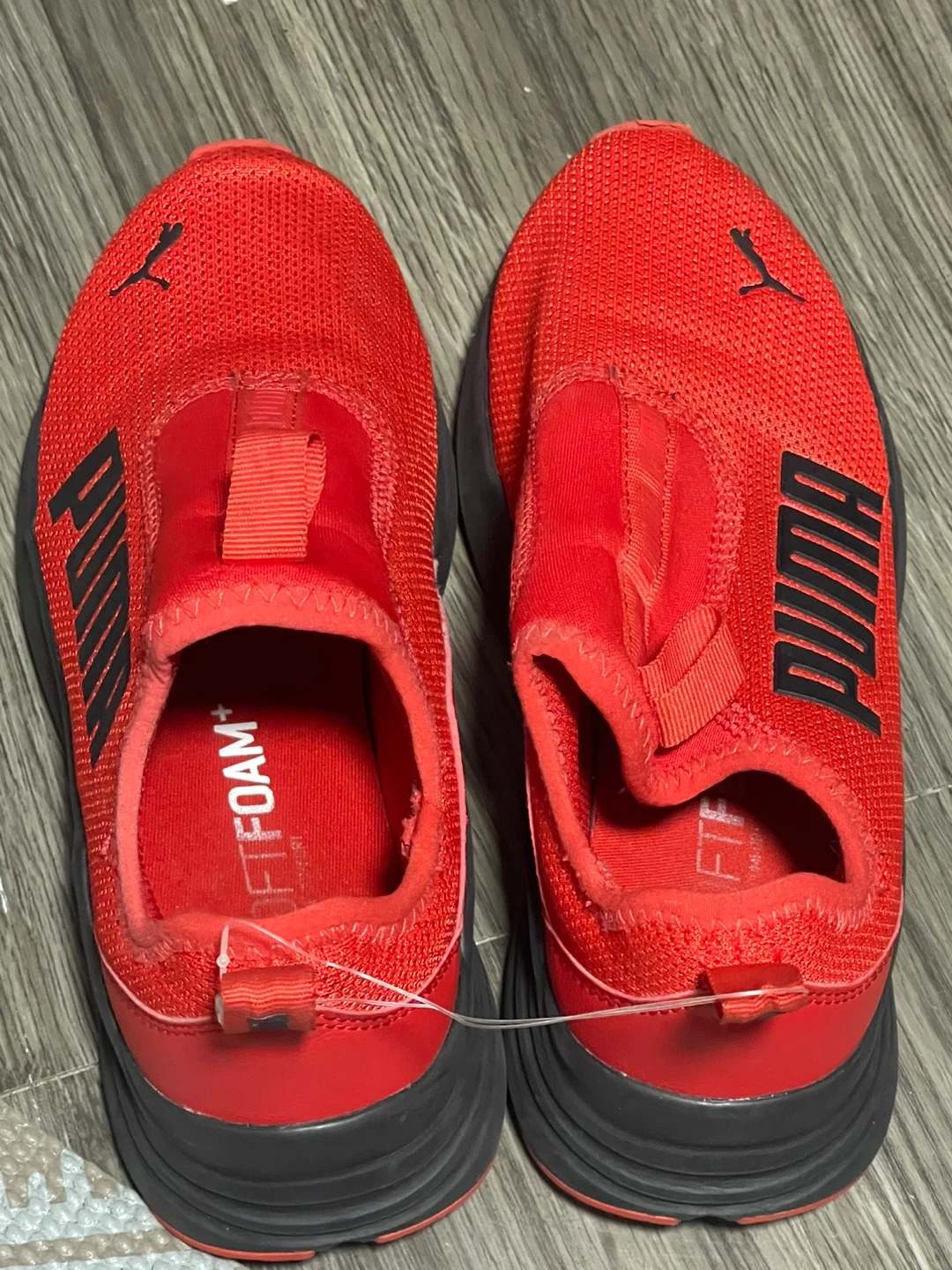 These red Puma athletic shoes feature a slip-on design for easy wear. The mesh upper provides breathability. Includes PUMA branding on the side and tongue.