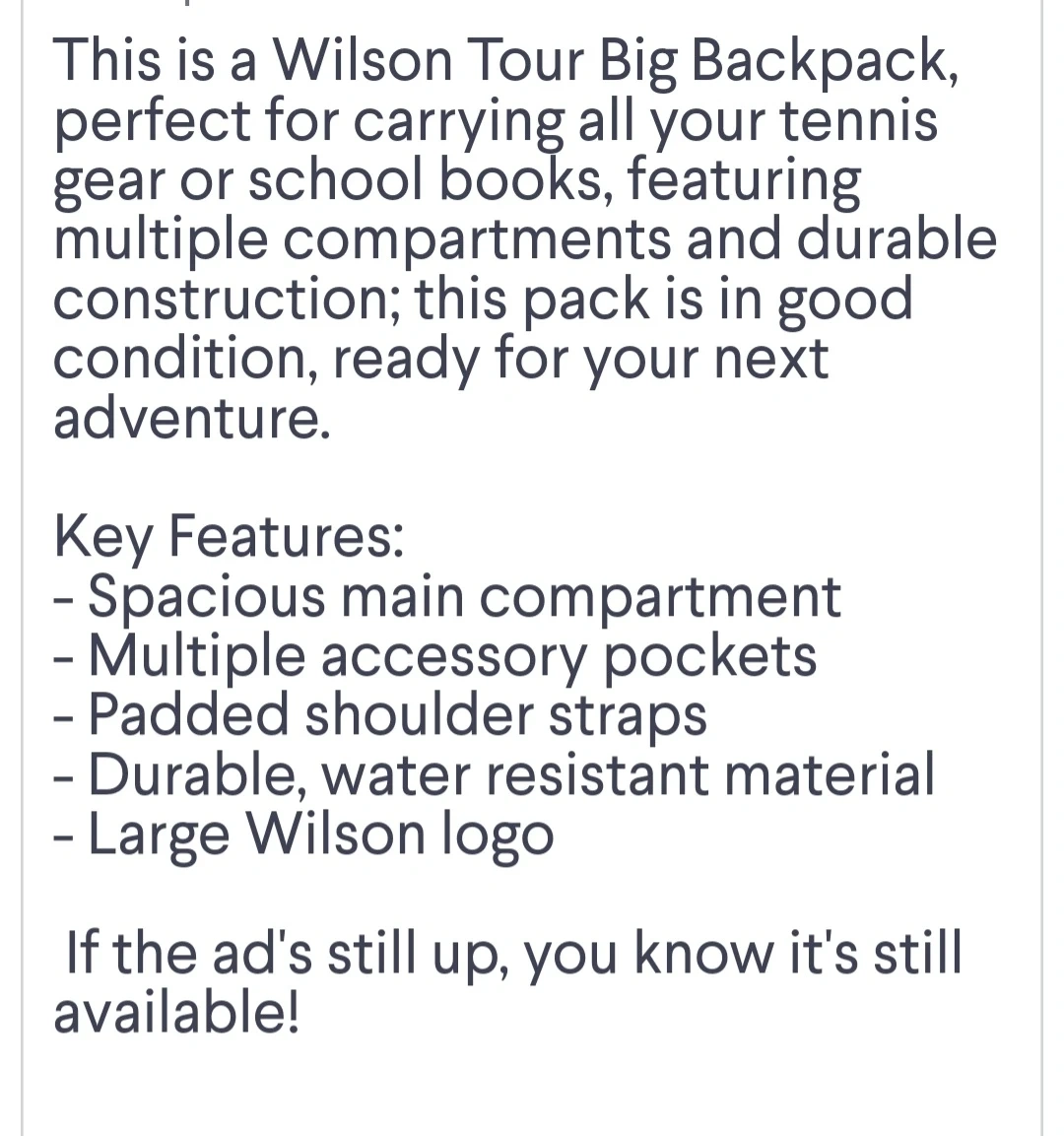 I have more Backpacks Crossbody Bags Belts Bags and Gym Bags for sale different prices different colors and different Brands if you want you can come to see all bags only cash.