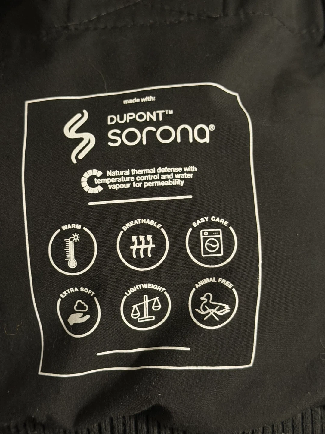 Selling a Zara black puffer jacket in size S. It features DuPont Sorona insulation for natural thermal defense and breathability.