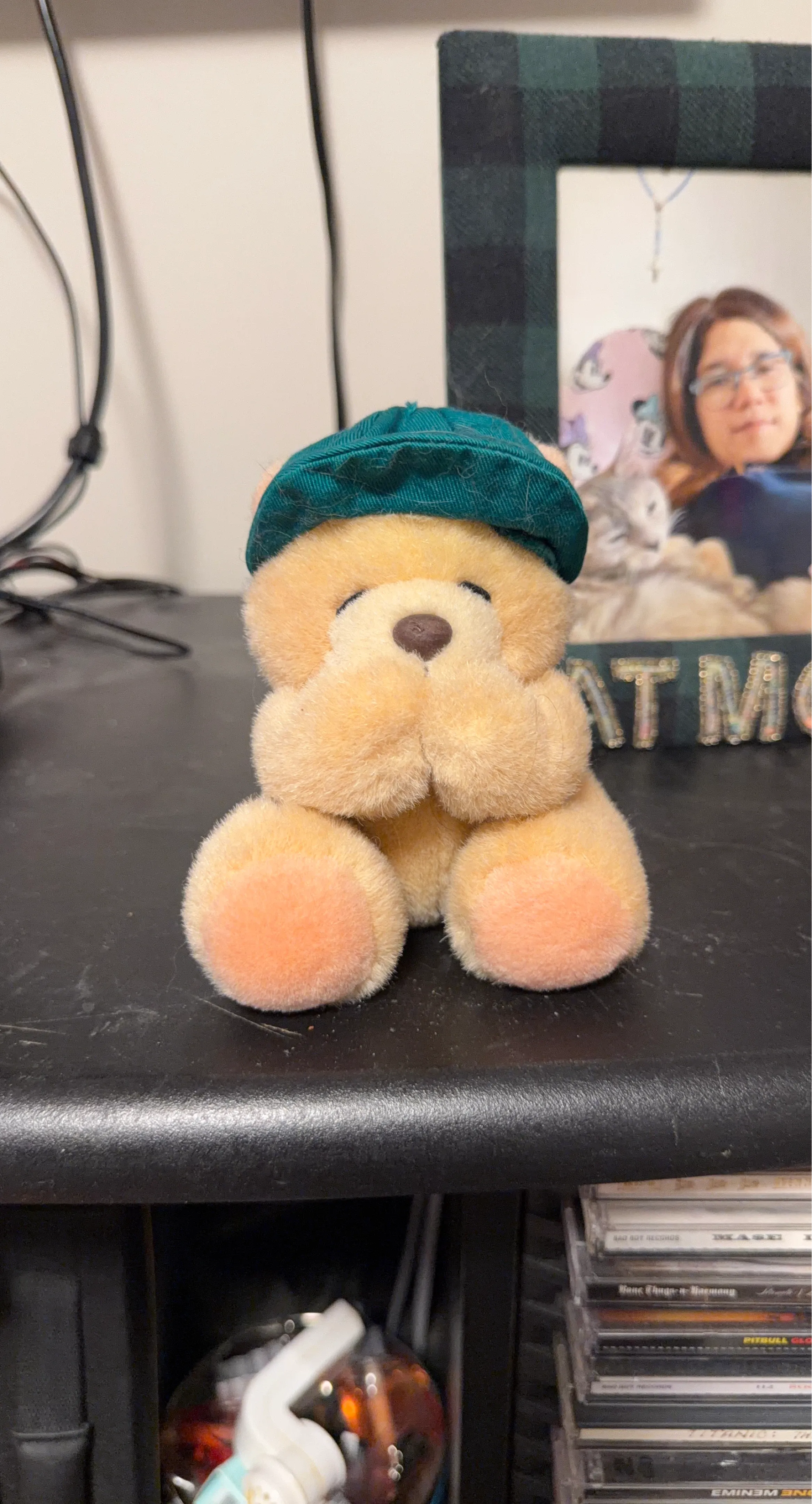 A light brown plush teddy bear wearing a green cap. It has soft, fuzzy paws and a cute, approachable face. This teddy bear is a nice size for display or gentle play.