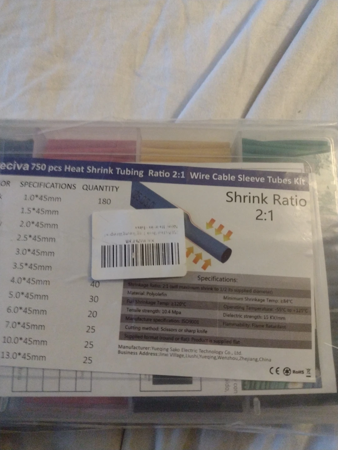 This is a 750 piece kit of Preciva heat shrink tubing with a 2:1 shrink ratio. It includes various sizes ranging from 1.0*45mm to 13.0*45mm, in multiple colours. The tubing is made of polyolefin material and can withstand temperatures up to 120°C. This kit is useful for protecting wire and cable connections.