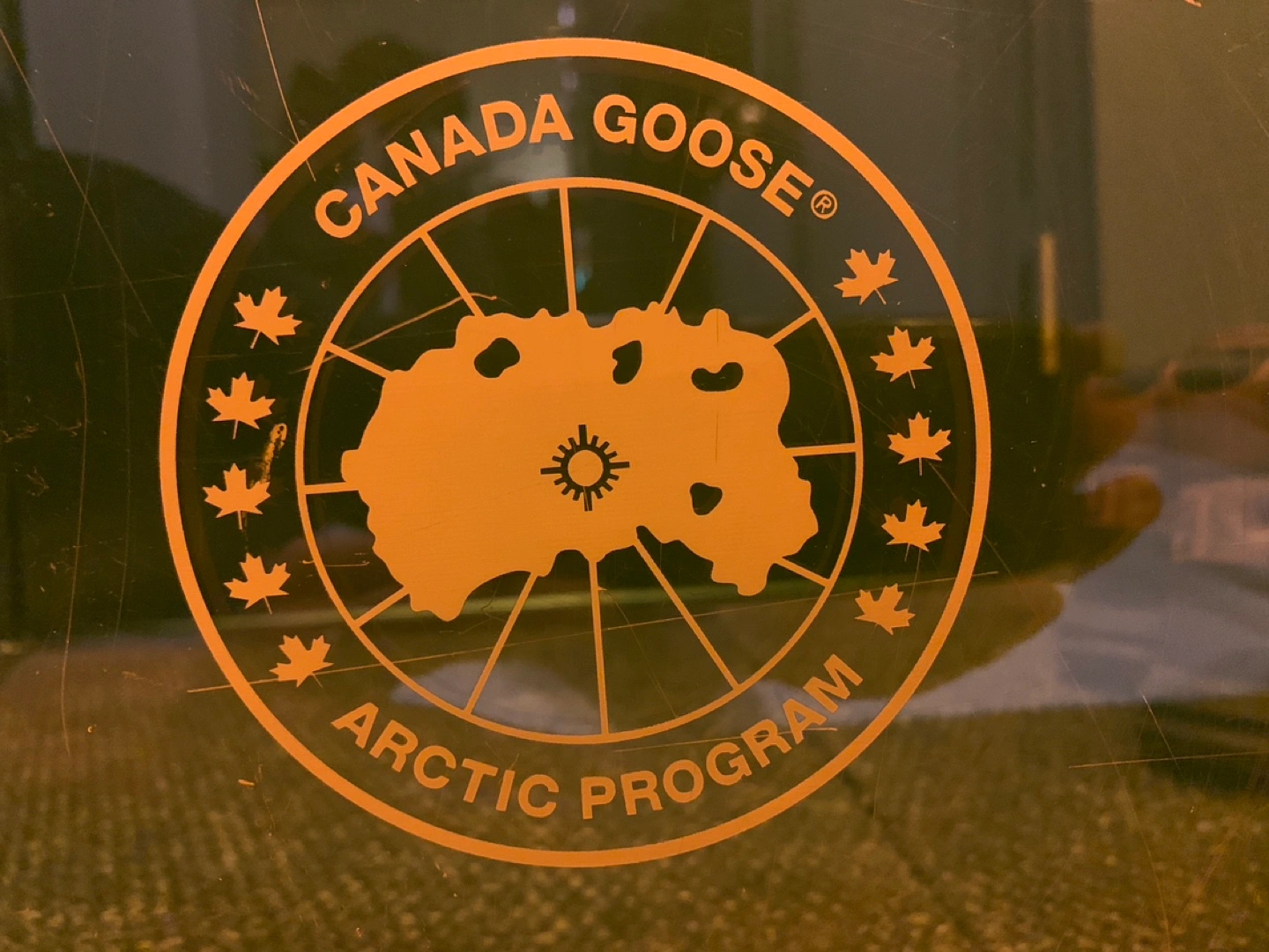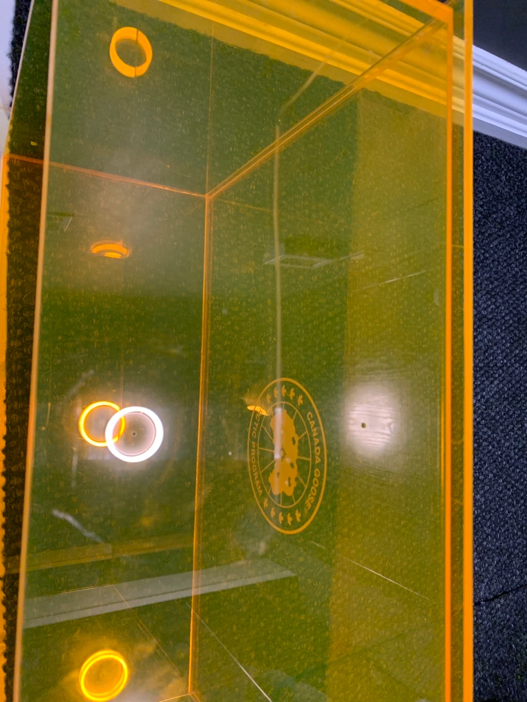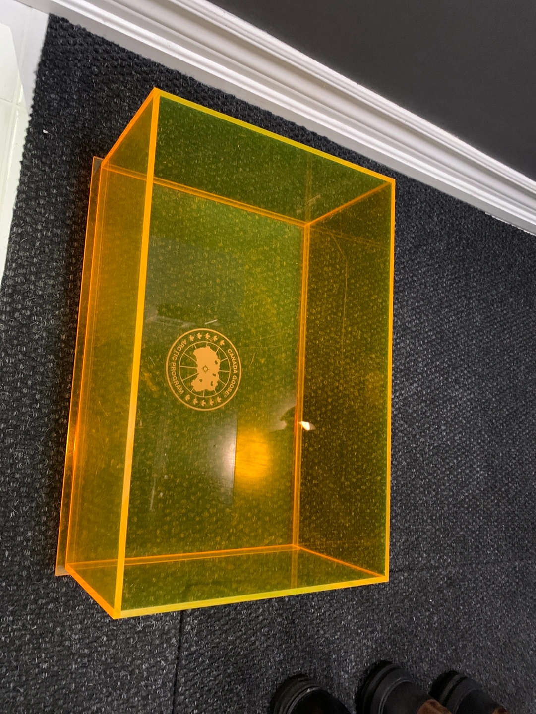 Orange coloured acrylic box. Features the Canada Goose Arctic Program logo. Shows some wear. As-is. Cash only.
