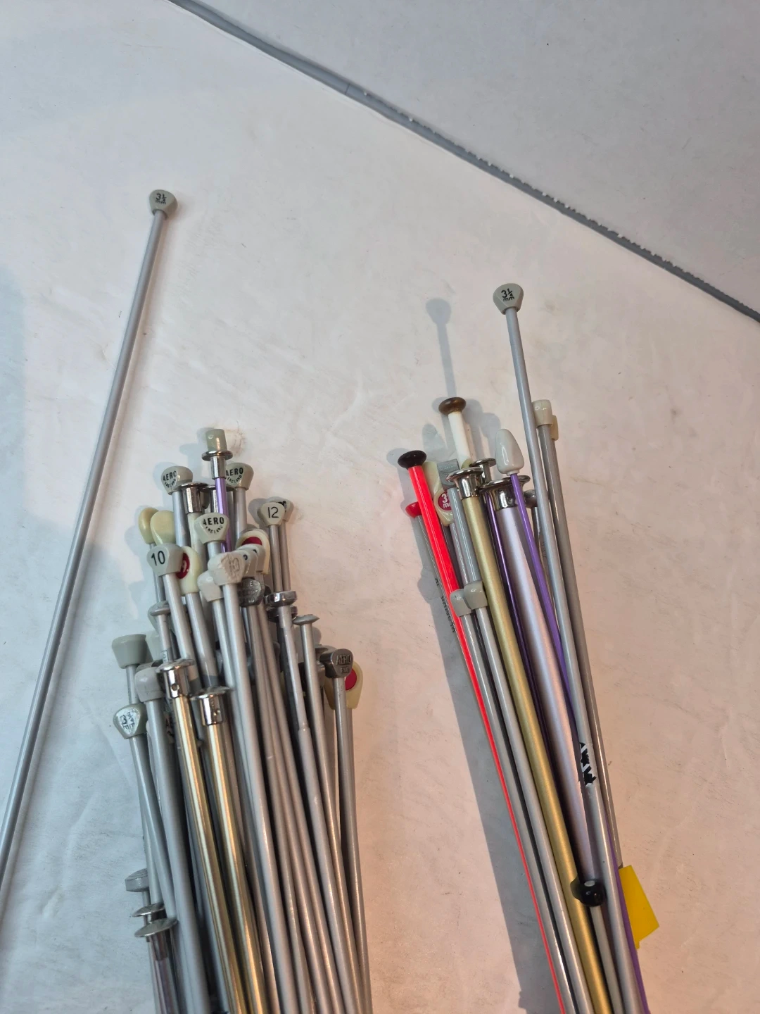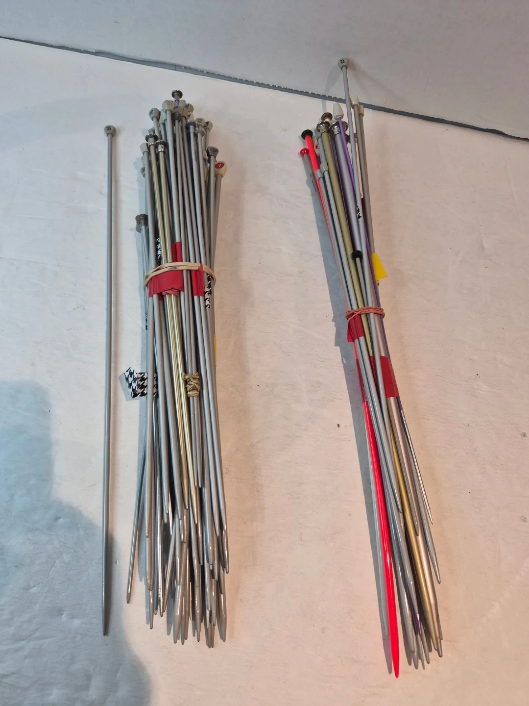 Collection of knitting needles in various sizes. Most are silver-coloured metal, with some colourful accents. Sizes visible include 2.75mm, 4mm, and 12mm. Perfect for knitters who need a variety of tools for different projects!