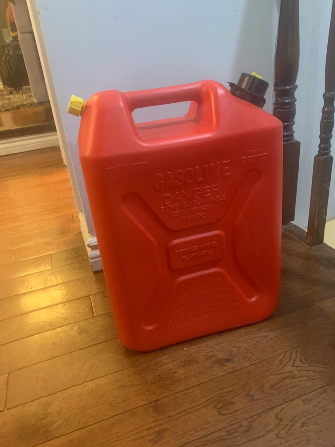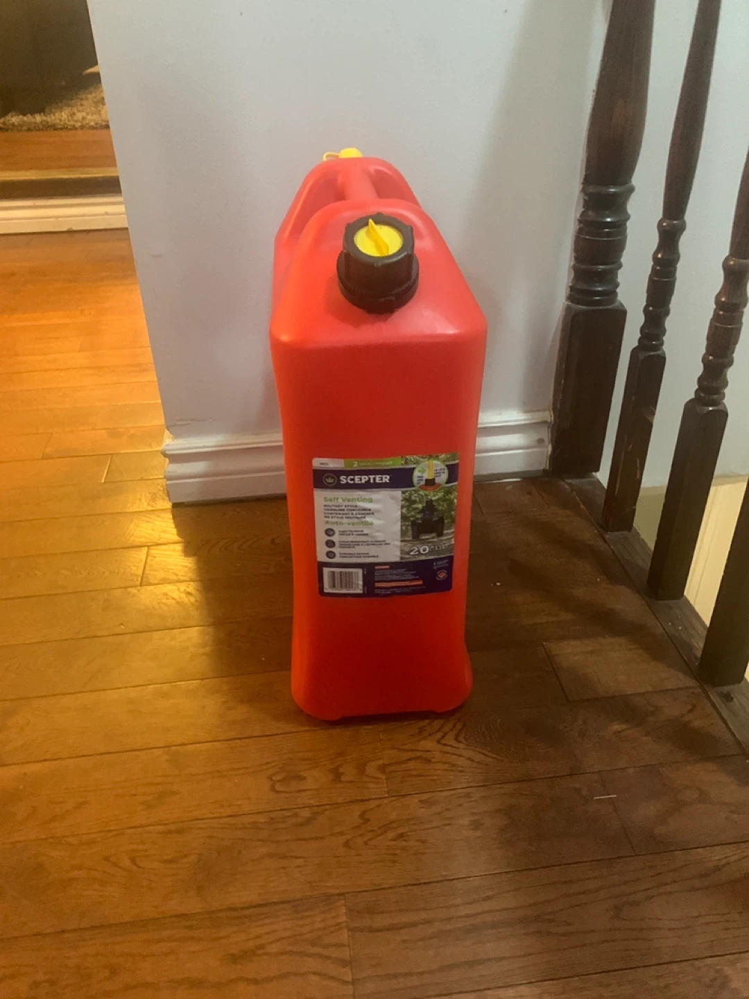 This is a Scepter 5-gallon gas can. It's made of durable red plastic. Great for storing and transporting gasoline for your vehicle or equipment.