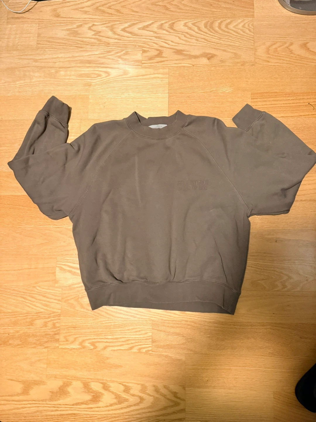 This is an ESSENTIALS Fear of God crewneck sweatshirt. It's made of soft material and features a dark taupe colour. This sweatshirt is great for everyday wear.