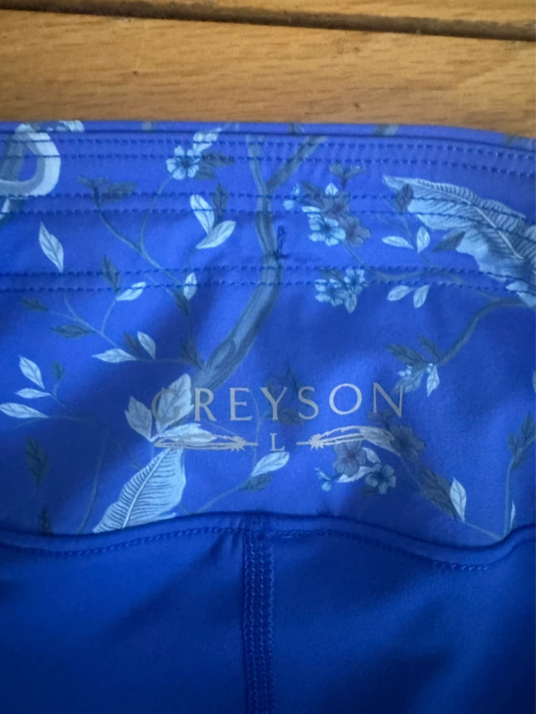 GREYSON athletic skirt with shorts in a vibrant blue with a repeating floral and bird pattern. It features a comfortable waistband and zippered pocket. This skirt is size large.