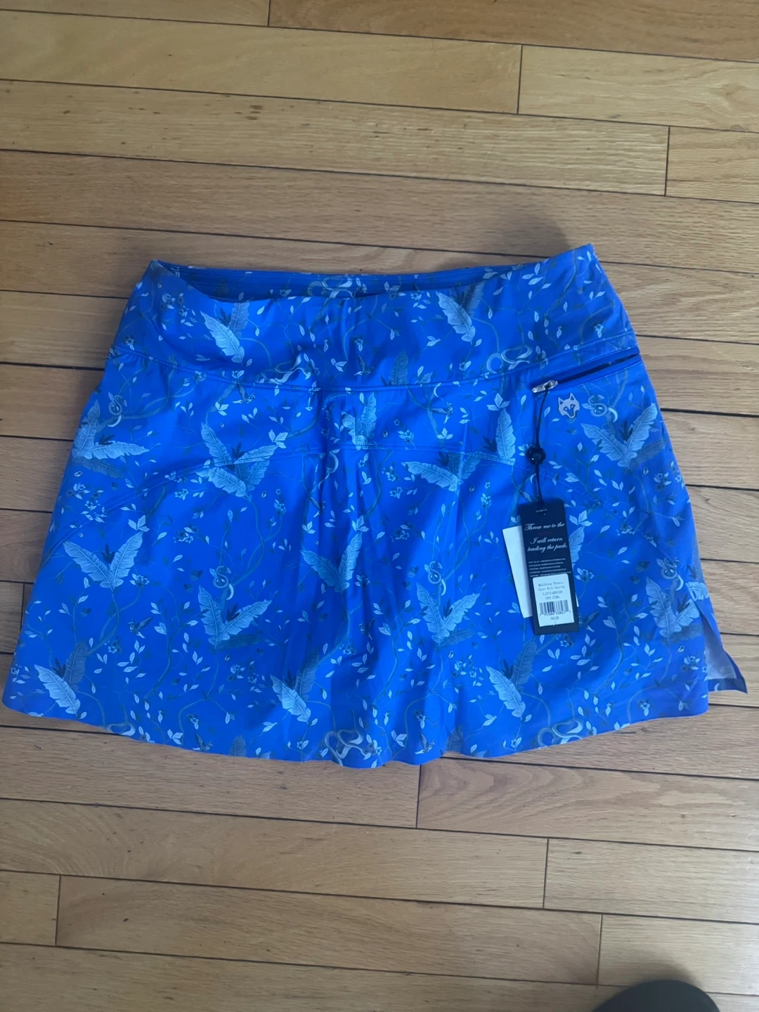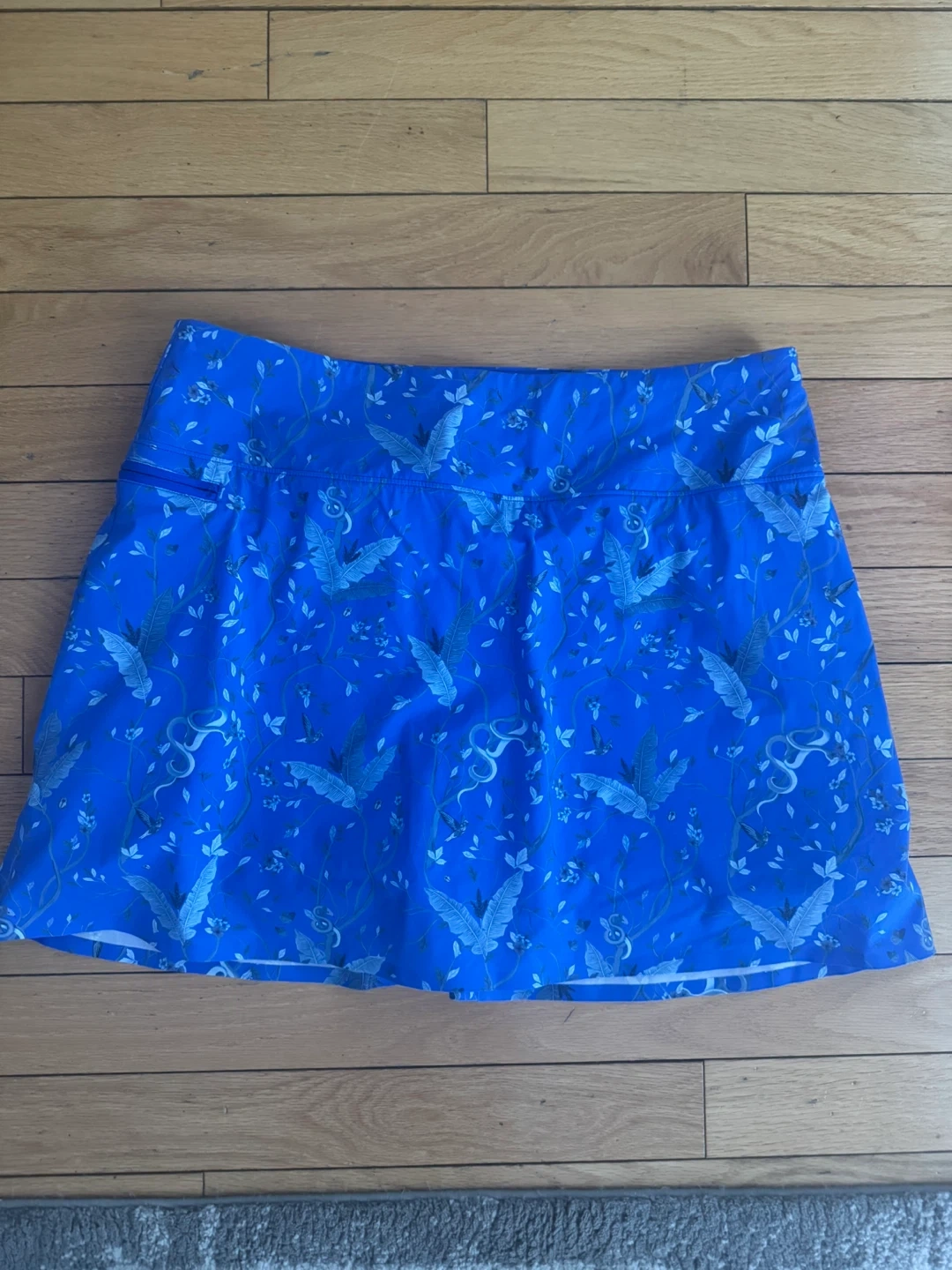 GREYSON athletic skirt with shorts in a vibrant blue with a repeating floral and bird pattern. It features a comfortable waistband and zippered pocket. This skirt is size large.