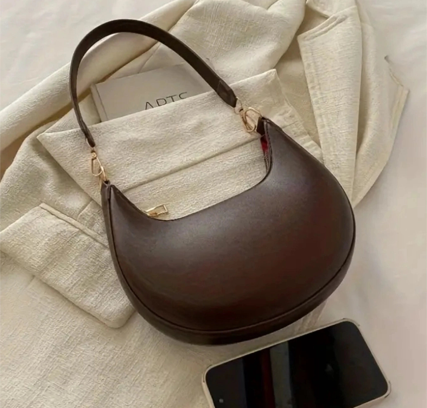 A stylish brown crescent bag is up for grabs! It's in great condition and perfect for adding a touch of chic to any outfit. The bag features a unique half-moon shape and a comfortable shoulder strap, making it both fashionable and practical