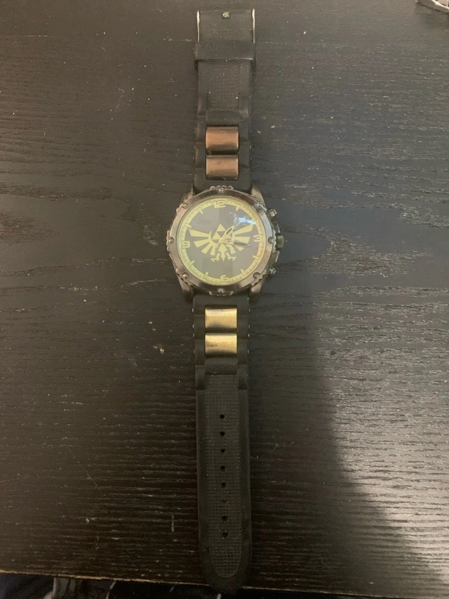 Selling a Legend of Zelda themed watch. It has a black rubber strap and a gold and black face with the Hyrule symbol. This watch is used, so please check the pictures. If the listing is still up, the watch is still available.