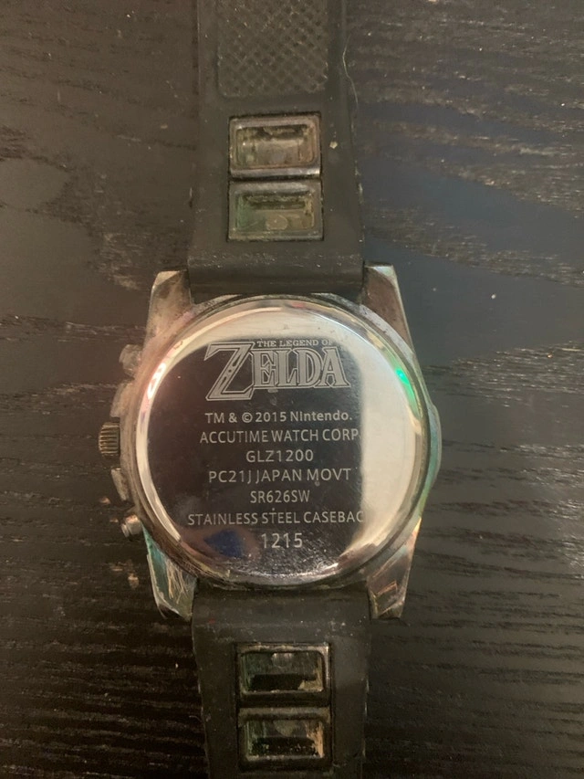 Selling a Legend of Zelda themed watch. It has a black rubber strap and a gold and black face with the Hyrule symbol. This watch is used, so please check the pictures. If the listing is still up, the watch is still available.